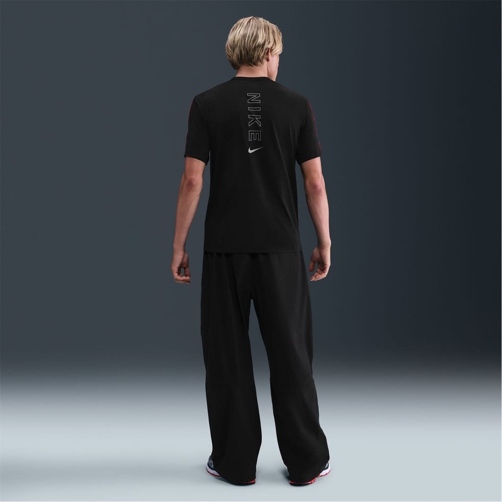 This Nike top is a staple in activewear, featuring a regular fit and a solid pattern. The short sleeves and crew neck design offer comfort and style. Embellished with a logo and badge, it adds a touch of brand identity to your wardrobe. -