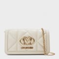 This Love Moschino wallet on chain is a stylish accessory featuring a geometric pattern. It comes with a flap closure and a shoulder handle for convenience. The clutch is adorned with chain embellishments, metal branding, and embossed details, adding a touch of elegance to its design. -