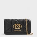 This Love Moschino wallet on chain is a stylish accessory featuring a textured design. It comes with a flap closure and a shoulder handle for convenience. The clutch is adorned with metal branding, a chain, and a logo, adding a touch of elegance to its overall look. -