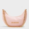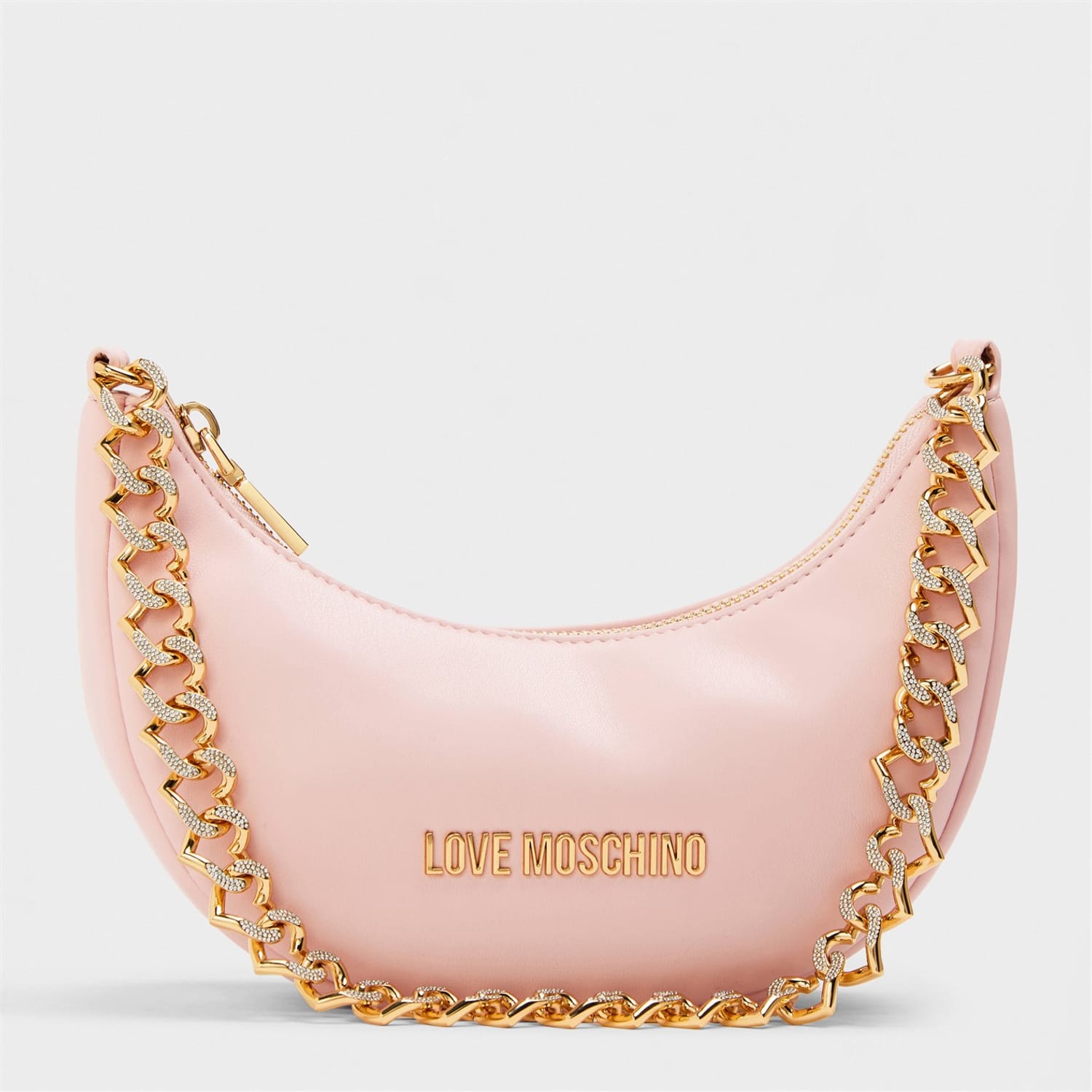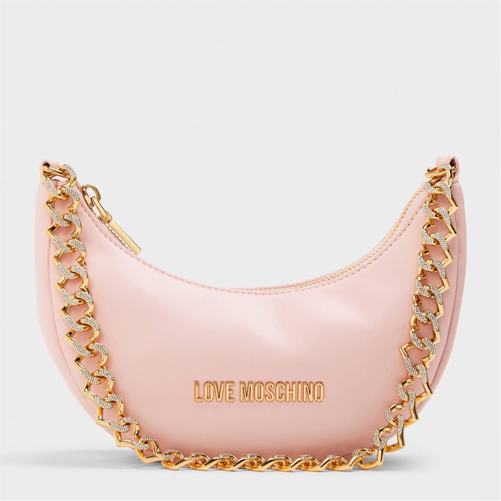 Discover the Love Moschino hobo bag, a stylish addition to your collection. This bag features a secure zipper closure and a comfortable shoulder handle for easy carrying. Adorned with a chic chain, sparkling rhinestones, and the iconic logo, it combines elegance with practicality, making it a must-have accessory. -