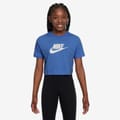 The Nike Futura cropped top is a casual essential featuring a crew neck and short sleeves. Designed with a regular fit, it showcases a large genie graphic print and a prominent logo embellishment, making it a standout piece in any wardrobe. -