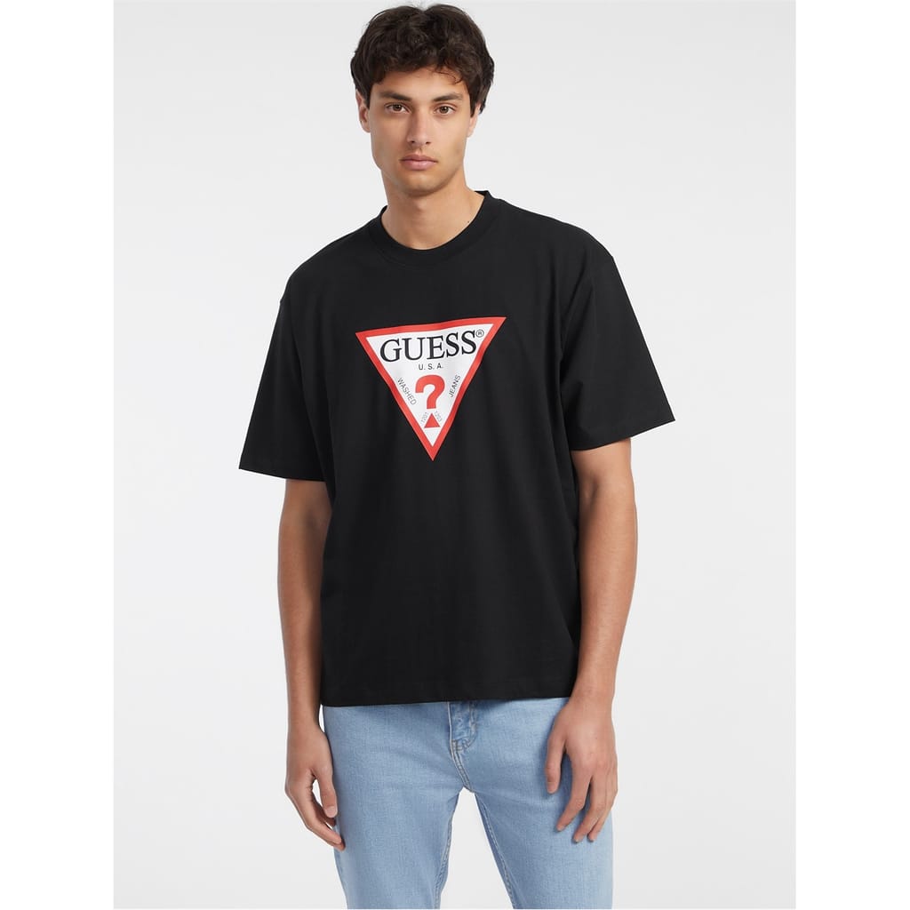This Guess top is a casual staple featuring a regular fit and a crew neck. The short sleeves and graphic print add a modern touch, while the logo embellishment provides a signature finish. -