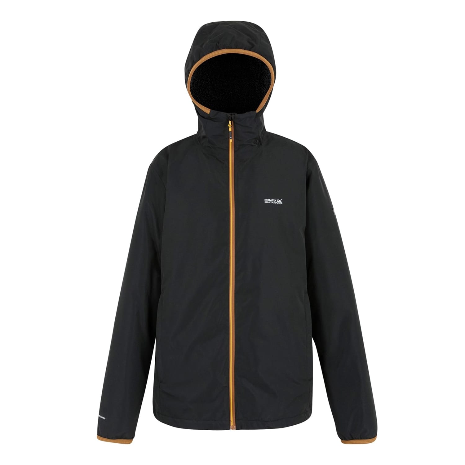 Stay dry with Regatta's water-repellent jacket, featuring a hooded neck and a solid pattern. This regular fit design includes a straight hem and a convenient zipper closure, ensuring practicality and style in wet conditions. -