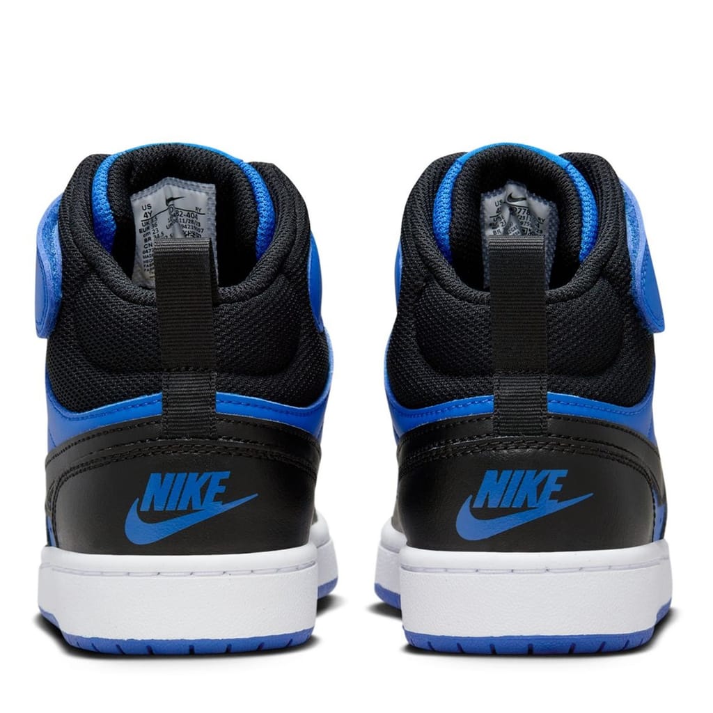 Style and comfort combine to make these Nike Court Borough Mid Top Junior Trainers which benefit from having a cushioned insole and padded ankle, whilst the textured sole is assisted by two pivot points to ensure great traction and mobility and the Nike Swoosh branding completes the iconic design.