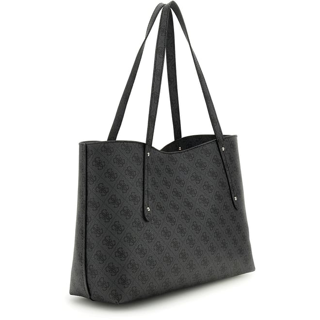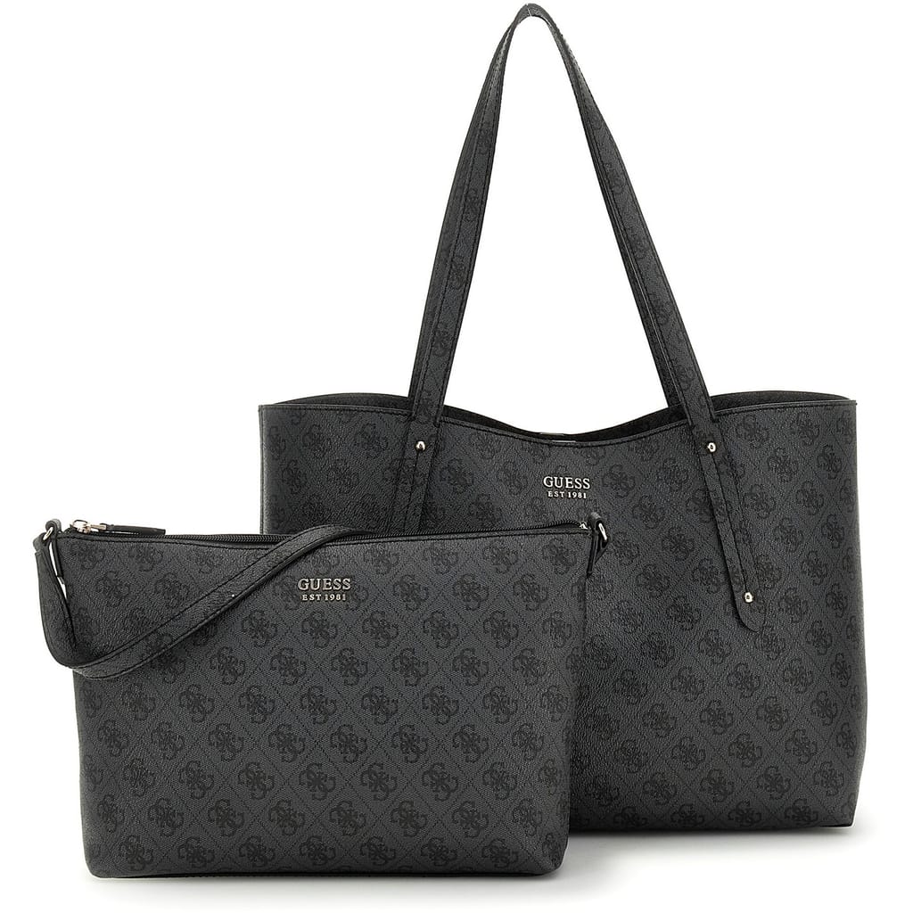 This Guess tote bag features an all-over logo pattern and is adorned with a monogram and metal branding. It is designed with a convenient zipper closure and a comfortable shoulder handle, making it both stylish and practical for daily use. -