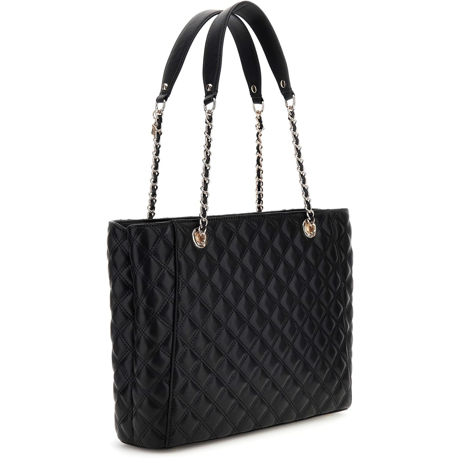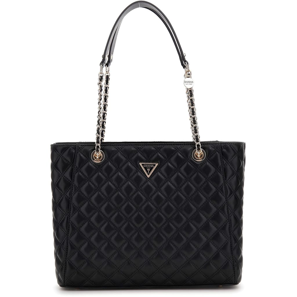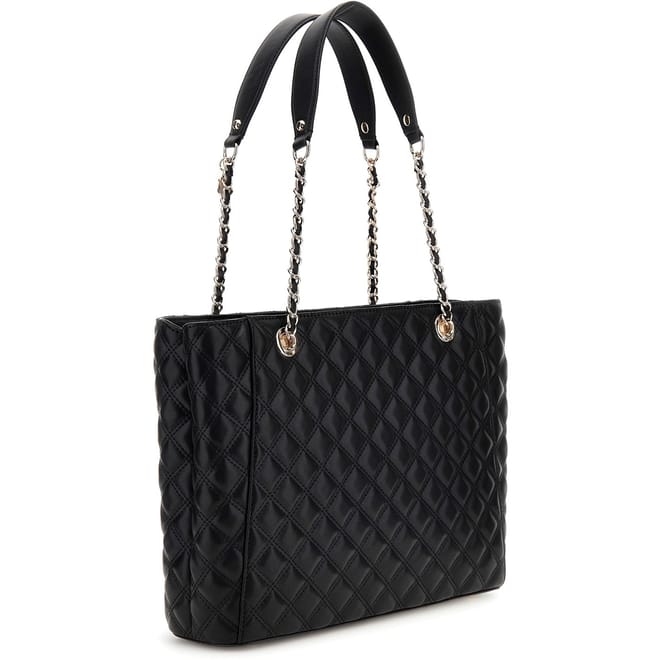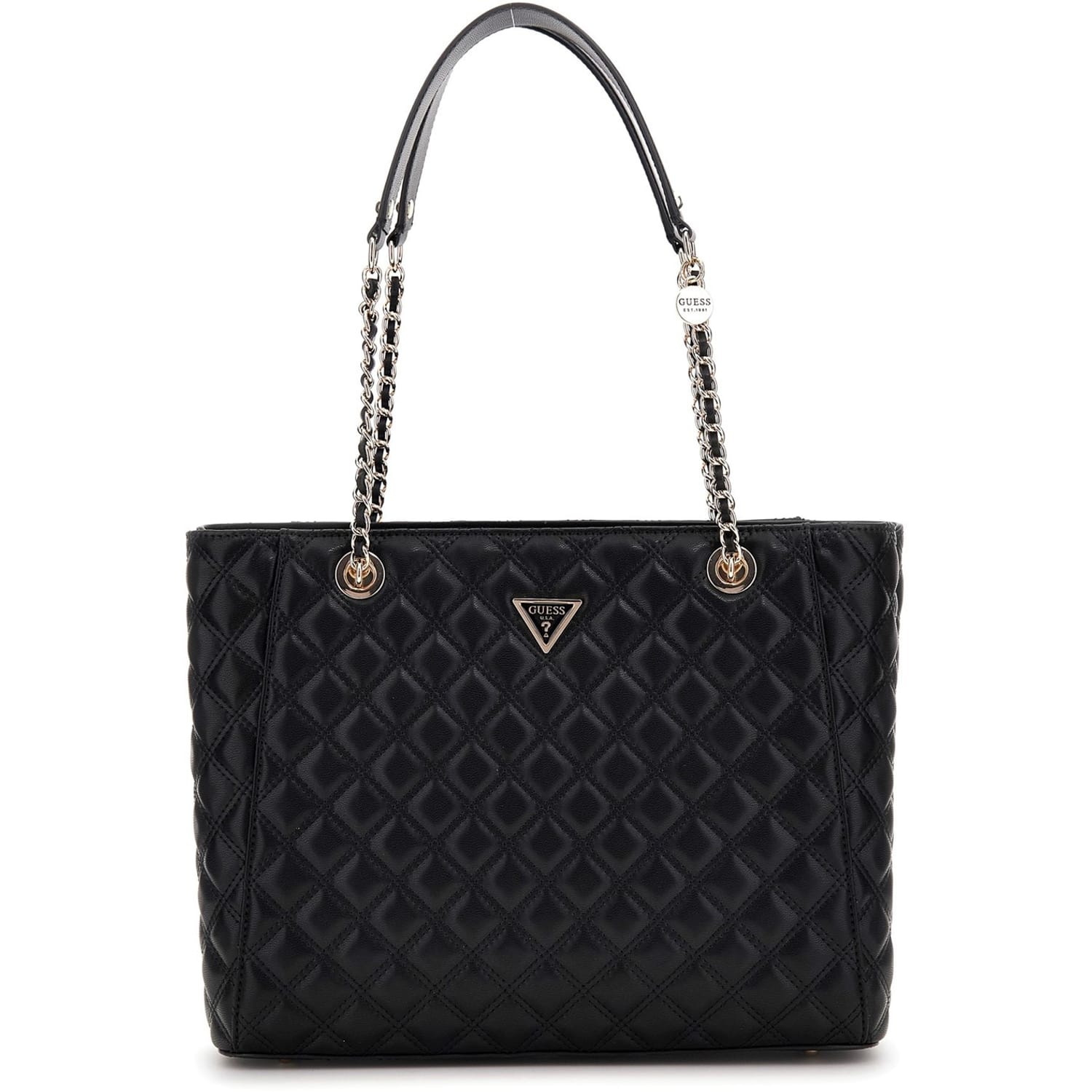 Elevate your ensemble with an edge of elegance with this Guess Giully Tote Bag. Expertly made from polyurethane in a faux leather composition this tote bag exudes stylish sophistication, providing a convenient carry for your everyday essentials. With two top handles and a chain strap allowing you to carry this handheld or on your shoulder for ease of carrying this bag allows you to wear it your way. A top zip fastening opens up to reveal a spacious interior and a zipped internal pocket for ease of access and organisation of your everyday essentials, especially with the external zip pocket allowing you to keep those small essentials at hand. Designed in a padded diamond look, in a classic colourway this bag is punctuated by the metallic Guess triangle for an iconic finish.