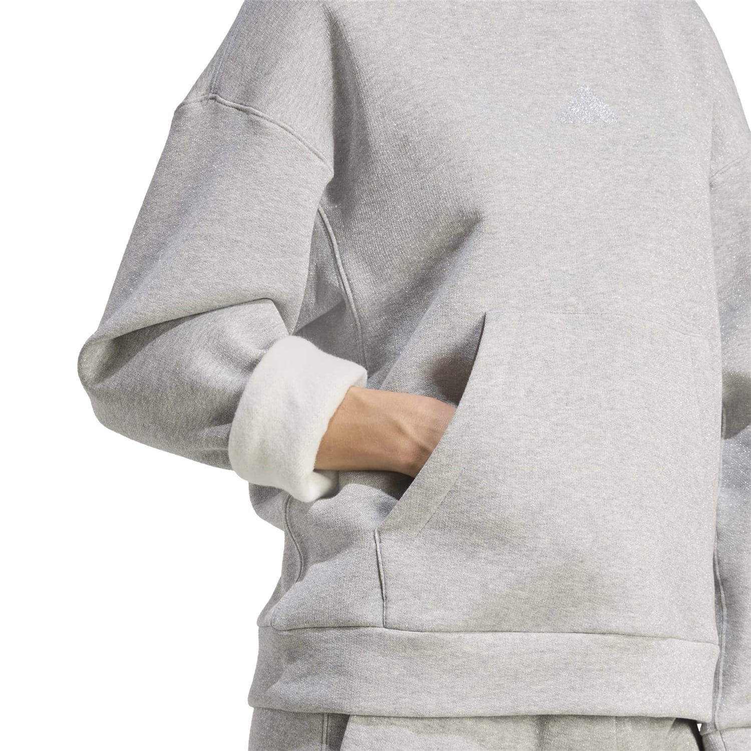 This adidas top features a hooded neck and long sleeves with a drop shoulder design. The relaxed fit ensures comfort, while the ribbed cuffs add a touch of style. The solid pattern is enhanced with glitter embellishments, making it a standout piece. -