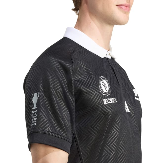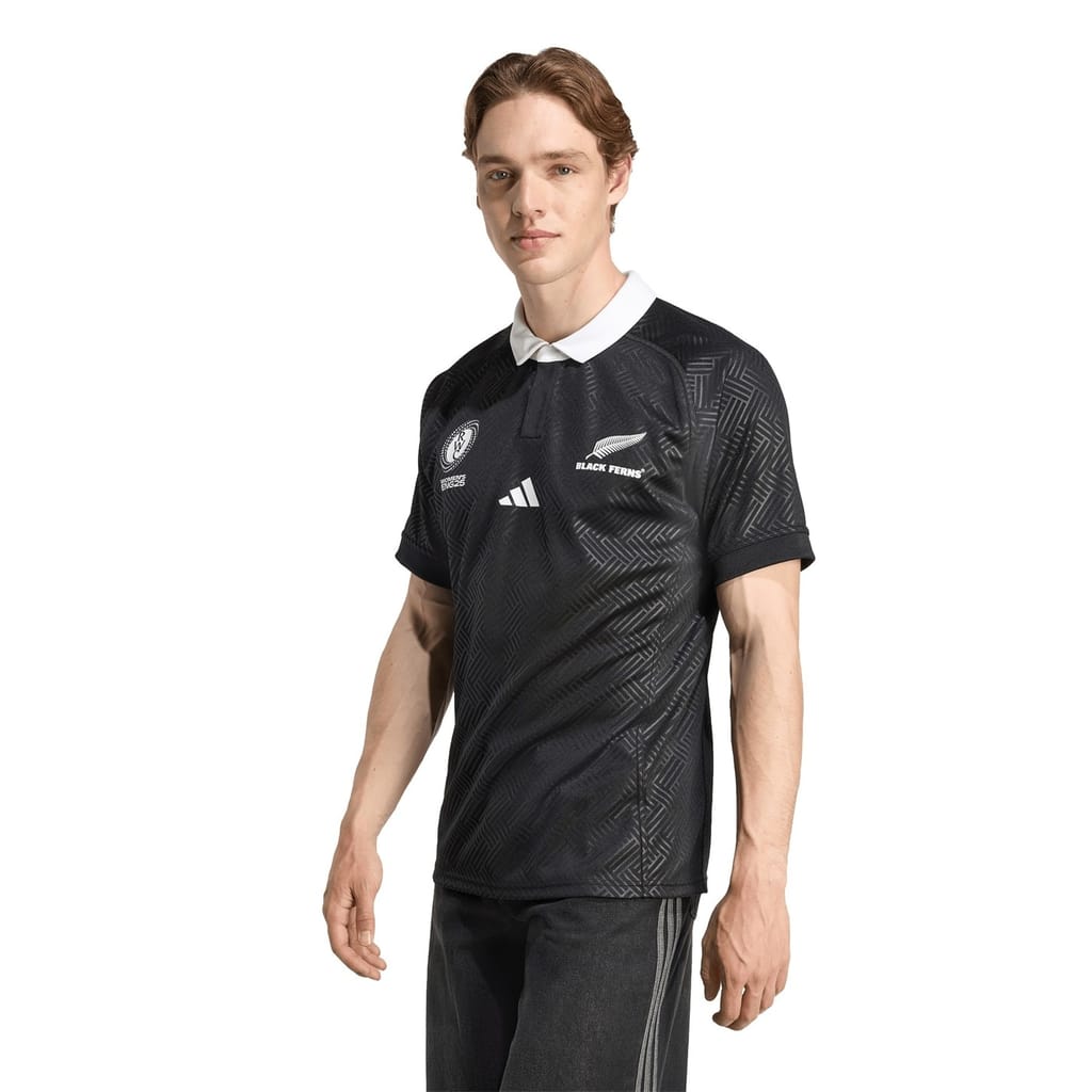 Represent the Black Ferns in style this year at the adidas Black Ferns Home Shirt 2025. A replica of the shirt set to be worn at the Rugby World Cup 2025, the elaborate Maori weave pattern is a nod to New Zealand's rich heritage. Completed in a soft fabric, this top is perfect for playing with the spirit of the Black Ferns or representing them away from the field.
