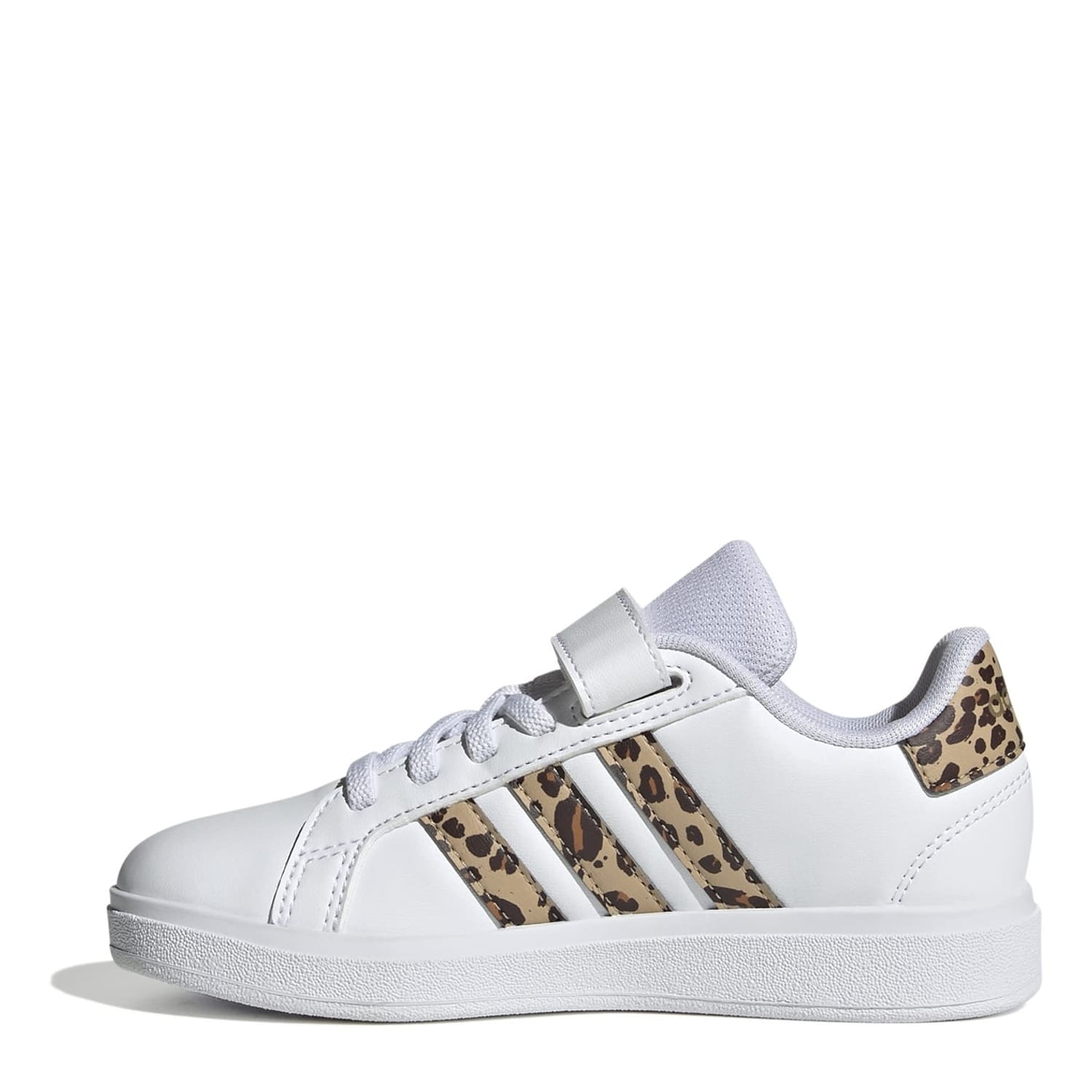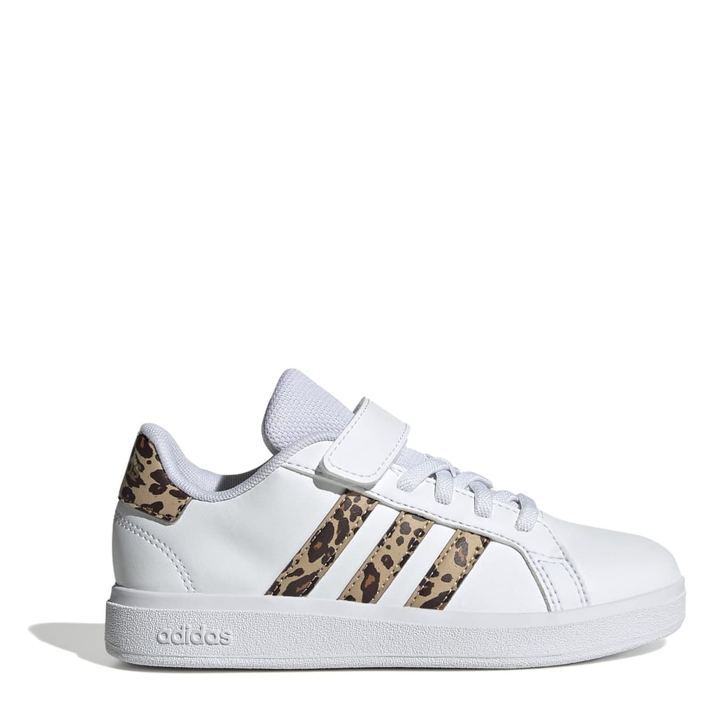 These adidas Grand Court Trainers are perfect for your little one casual looks. Whilst crafted with a cushioned insole and padded ankle collar for enhanced comfort, these trainers boast a textured rubber outsole which provides great traction and a hook-and-loop tape fastening allows for added security. With adidas branding throughout, the iconic three stripe branding completes the classic and stylish look. -