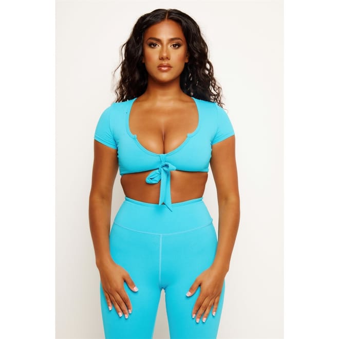 This Honeyz cropped top is a stylish addition to your activewear collection. Featuring a scoop neck and a tie front closure, it offers a slim fit with short sleeves. The solid pattern adds a classic touch, making it a versatile piece for various occasions. -