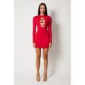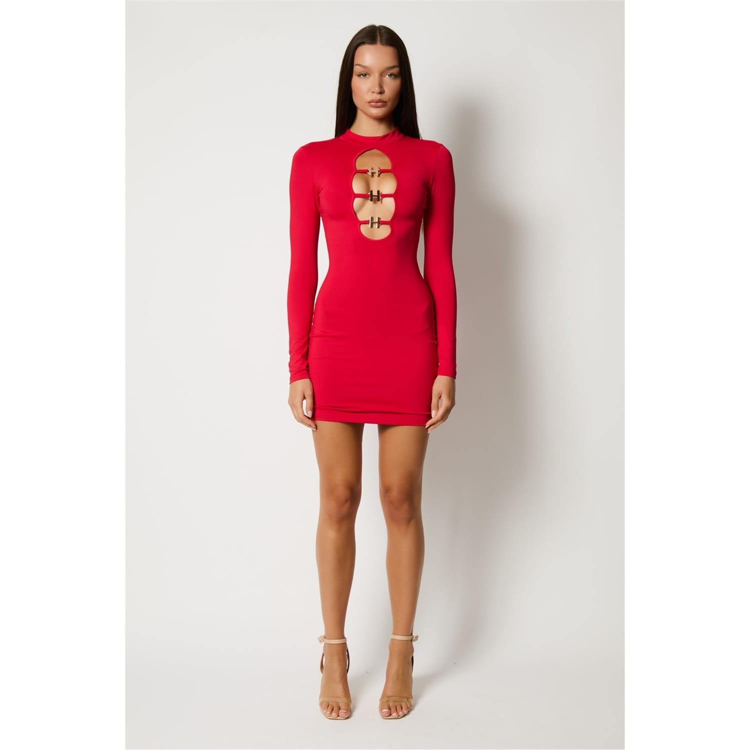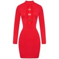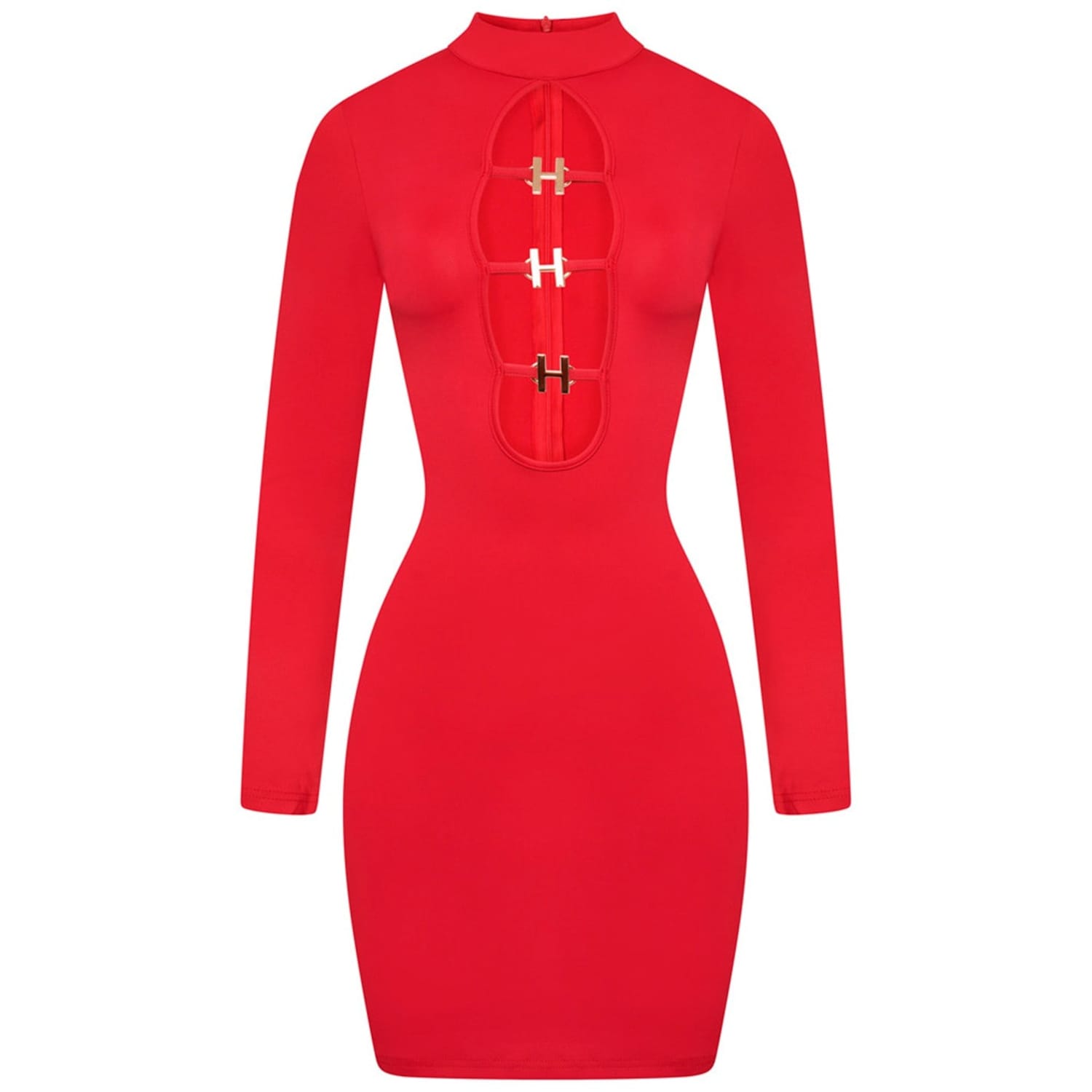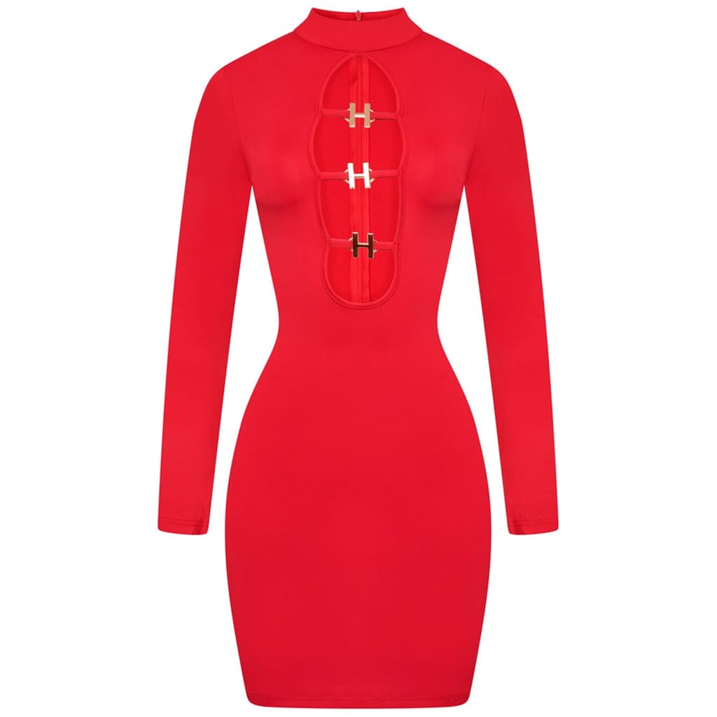 This Honeyz mini dress is a sleek bodycon style, featuring a high neck and long sleeves. Crafted in a solid pattern, it offers a slim fit with a straight hemline. The dress is designed with a buckle closure, adding a touch of sophistication to its overall look. -