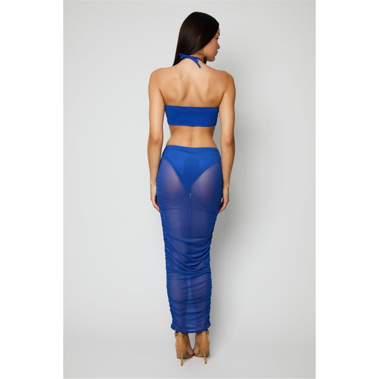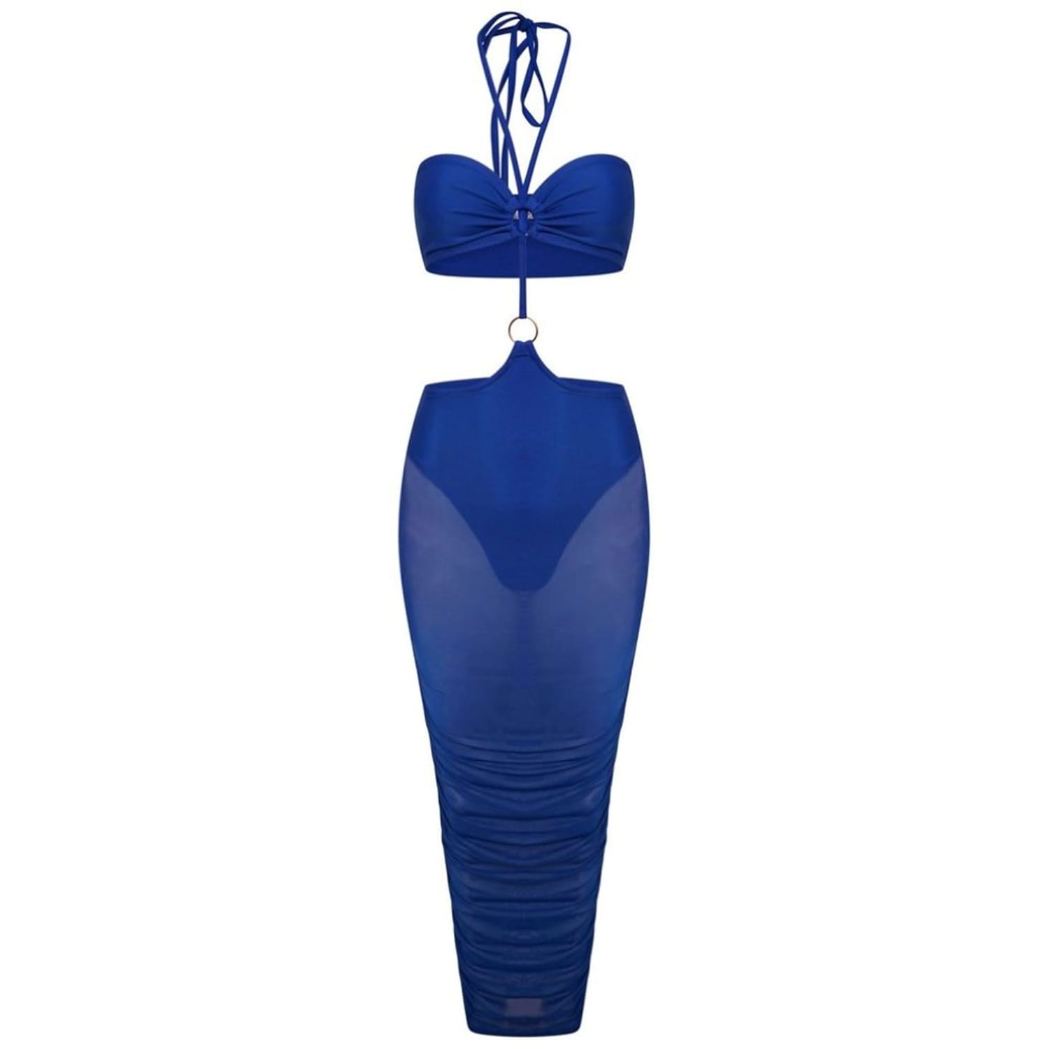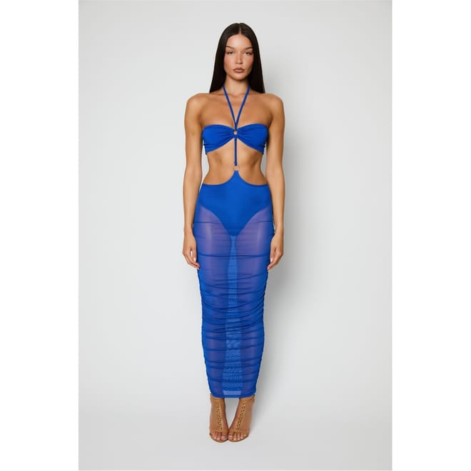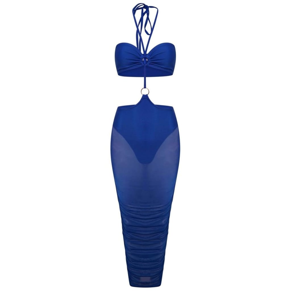 This Honeyz maxi dress is a stunning addition to your wardrobe. Featuring a halter neckline and a slim fit, it offers a sleek silhouette. The solid pattern is complemented by mesh details and cut-out embellishments, adding a touch of elegance. Perfect for those who appreciate a stylish slip dress. -