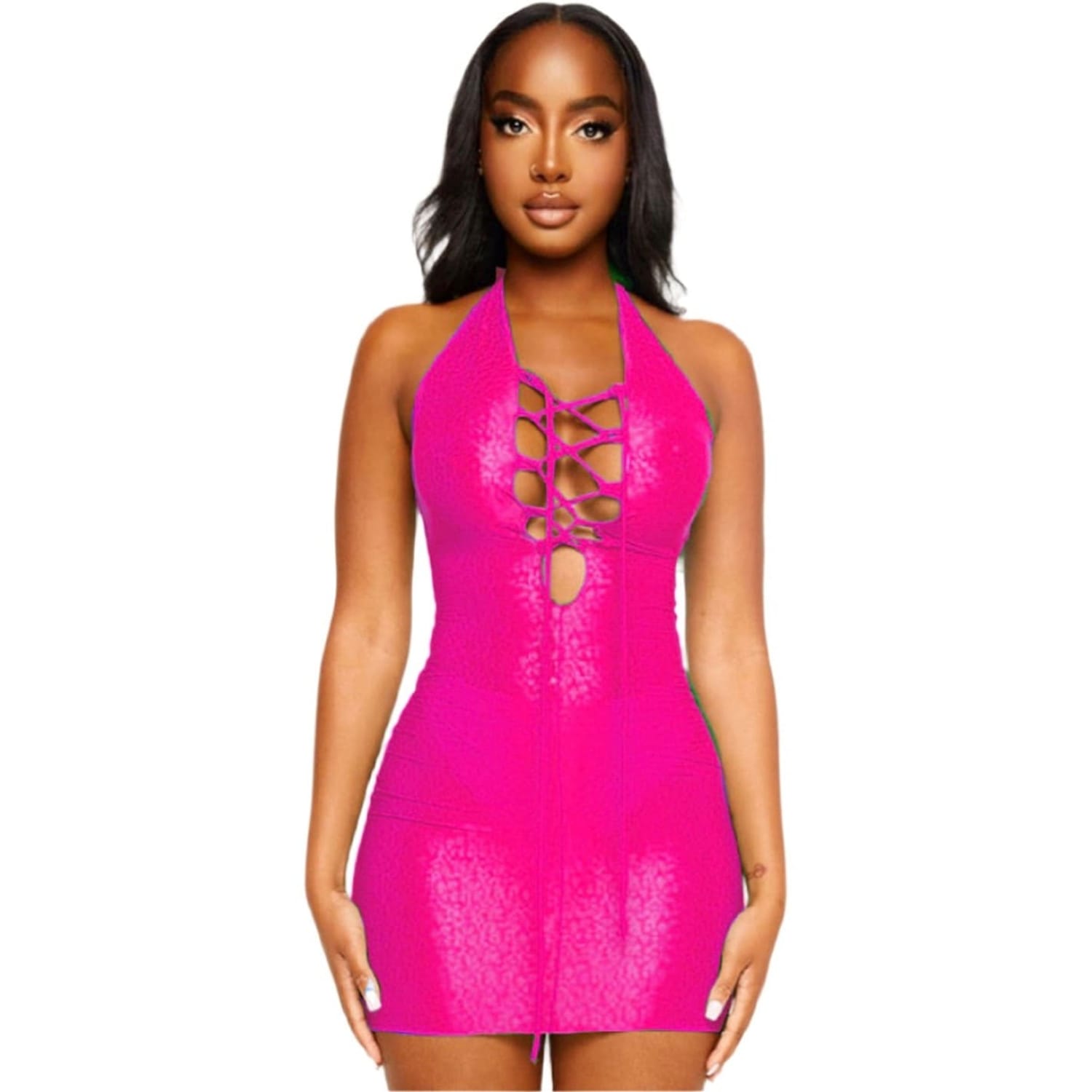 This Honeyz mini dress is a striking addition to your wardrobe. Featuring a halter neckline and a bodycon style, it offers a slim fit that accentuates your silhouette. The snake skin textured pattern adds a unique touch, while the lace-up closure provides a secure fit. Perfect for making a statement, this dress combines elegance with a modern edge. -