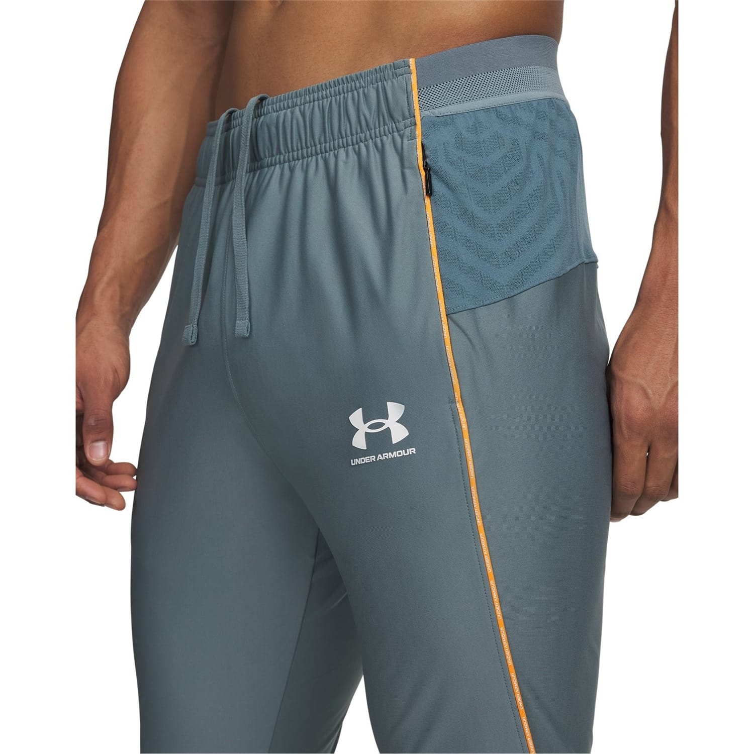 Under Armour presents these performance track pants, perfect for running enthusiasts. Designed with a slim fit, they feature a drawstring closure for a secure fit. Part of the activewear collection, these pants are adorned with a logo, adding a touch of brand identity. Ideal for those seeking comfort and style during athletic activities. -