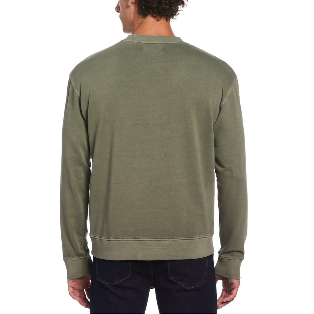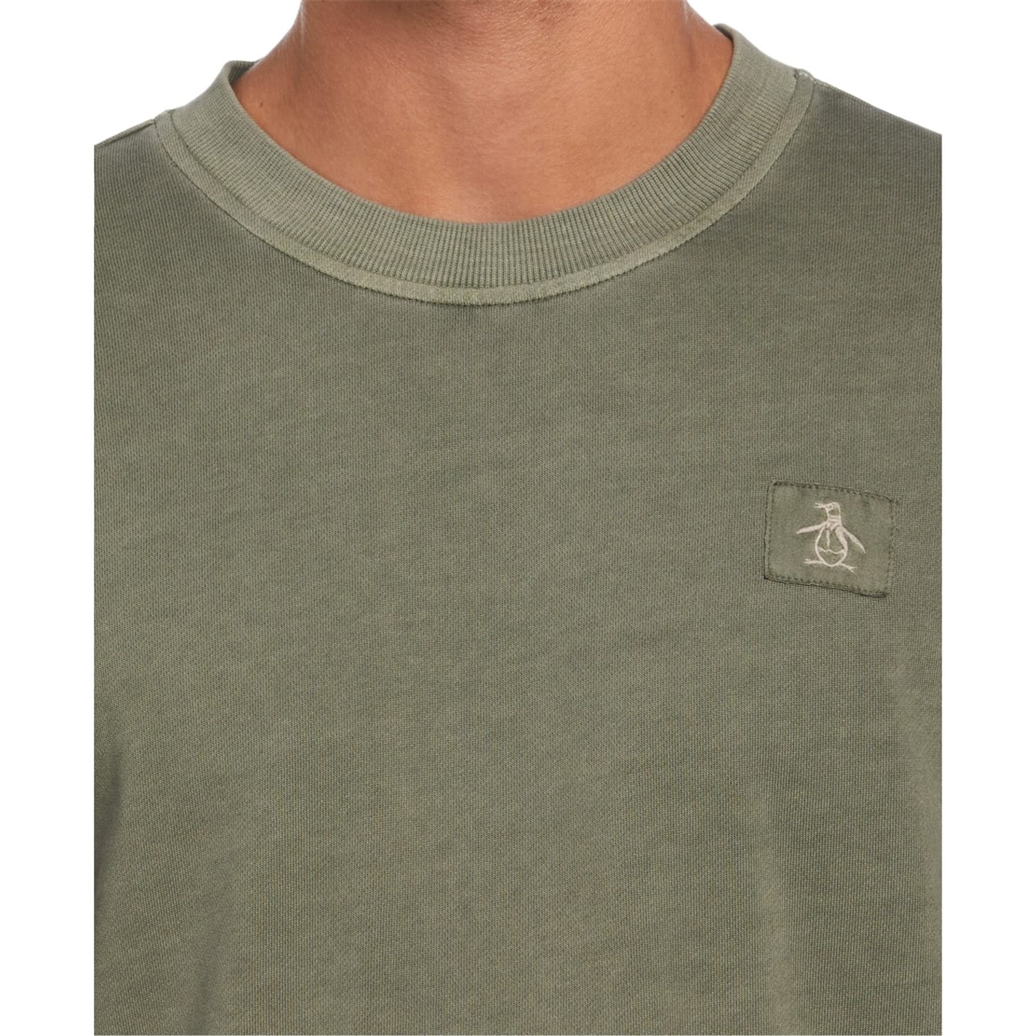 This Original Penguin top features a solid pattern with a crew neck and long sleeves. It offers a regular fit, complemented by ribbed cuffs and collar. The design is enhanced with a distinctive penguin graphic and a logo patch, adding a touch of brand identity. -