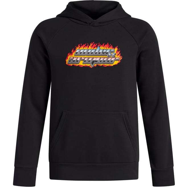 This Under Armour top features a hooded neck and long raglan sleeves, offering a regular fit. The ribbed cuffs add a touch of detail, while the graphic print showcases flame and lettering designs. Embellished with a logo and pocket, this piece is part of the casual collection, perfect for a laid-back style. -