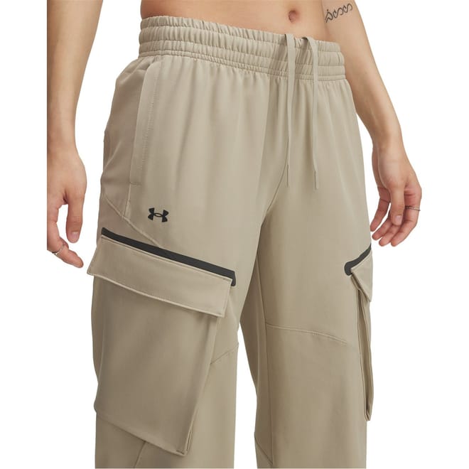Under Armour cargo joggers offer a blend of style and functionality. Featuring a drawstring closure, these combat pants are designed for comfort and practicality. The joggers include side pockets and a logo embellishment, making them a versatile addition to any casual collection. -