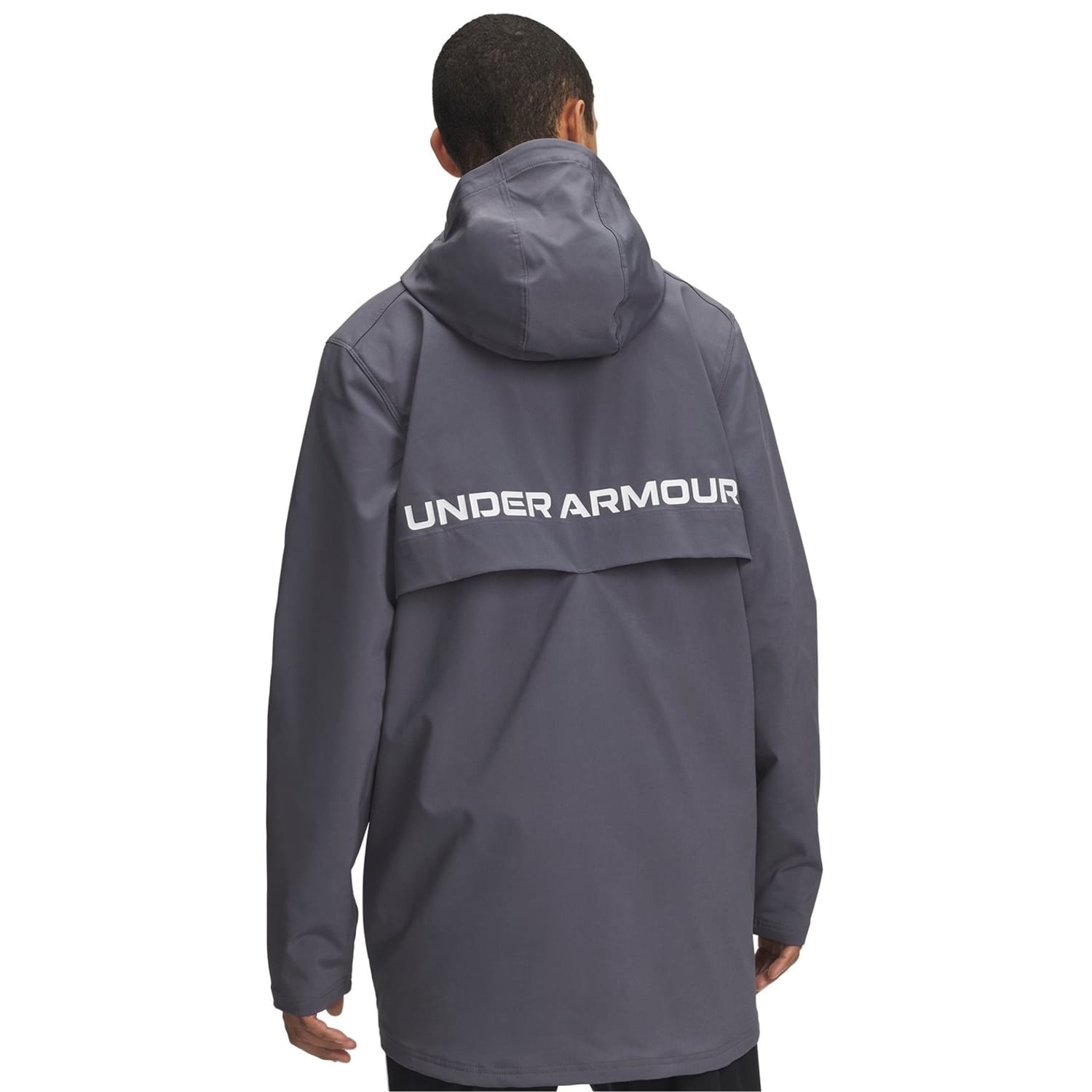 This Under Armour rain jacket is designed with a hooded neckline and features a water-repellent finish. It has a regular fit with a straight hem and a solid pattern. The jacket includes a zipper closure with snap buttons and is embellished with a logo. -