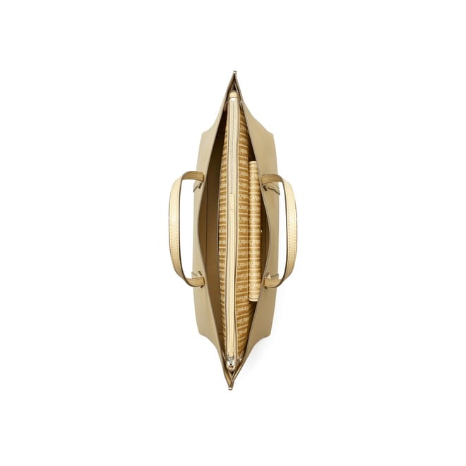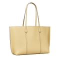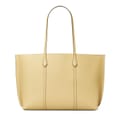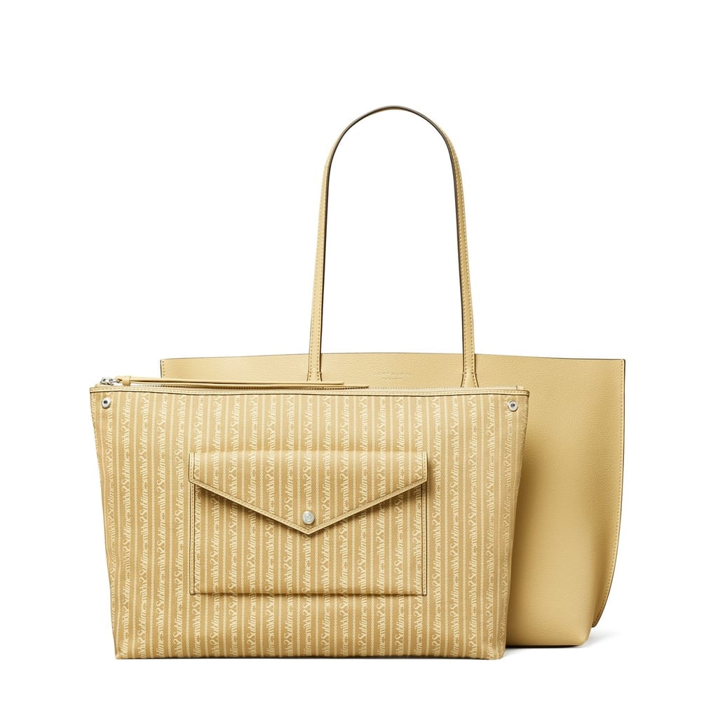 Discover the Tory Burch tote, a stylish addition to your collection. This bag features a secure zipper closure and a convenient shoulder handle for easy carrying. The elegant design is complemented by a subtle logo embellishment, adding a touch of sophistication to your ensemble. -