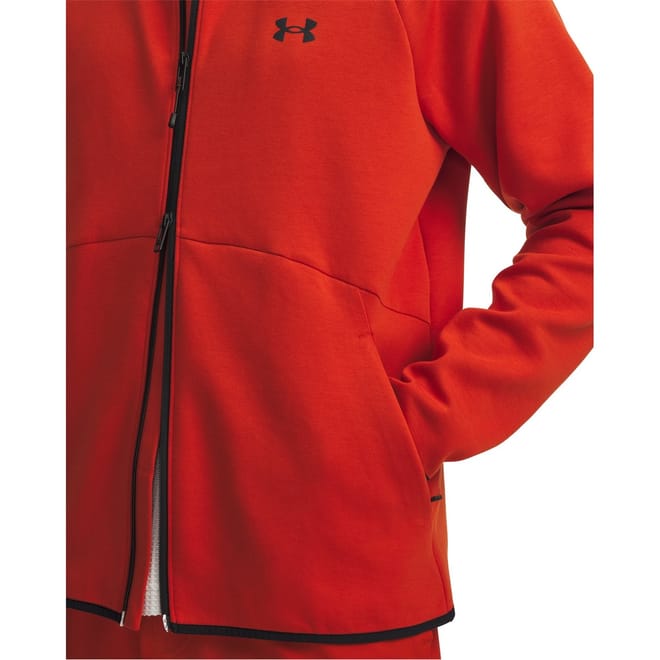 This Under Armour sweatshirt jacket is designed for activewear enthusiasts. Featuring a hooded neckline and a full zipper closure, it offers a relaxed fit with raglan sleeves and ribbed cuffs for comfort. The solid pattern and logo embellishment add a sleek touch, while the straight hem completes the look. -