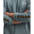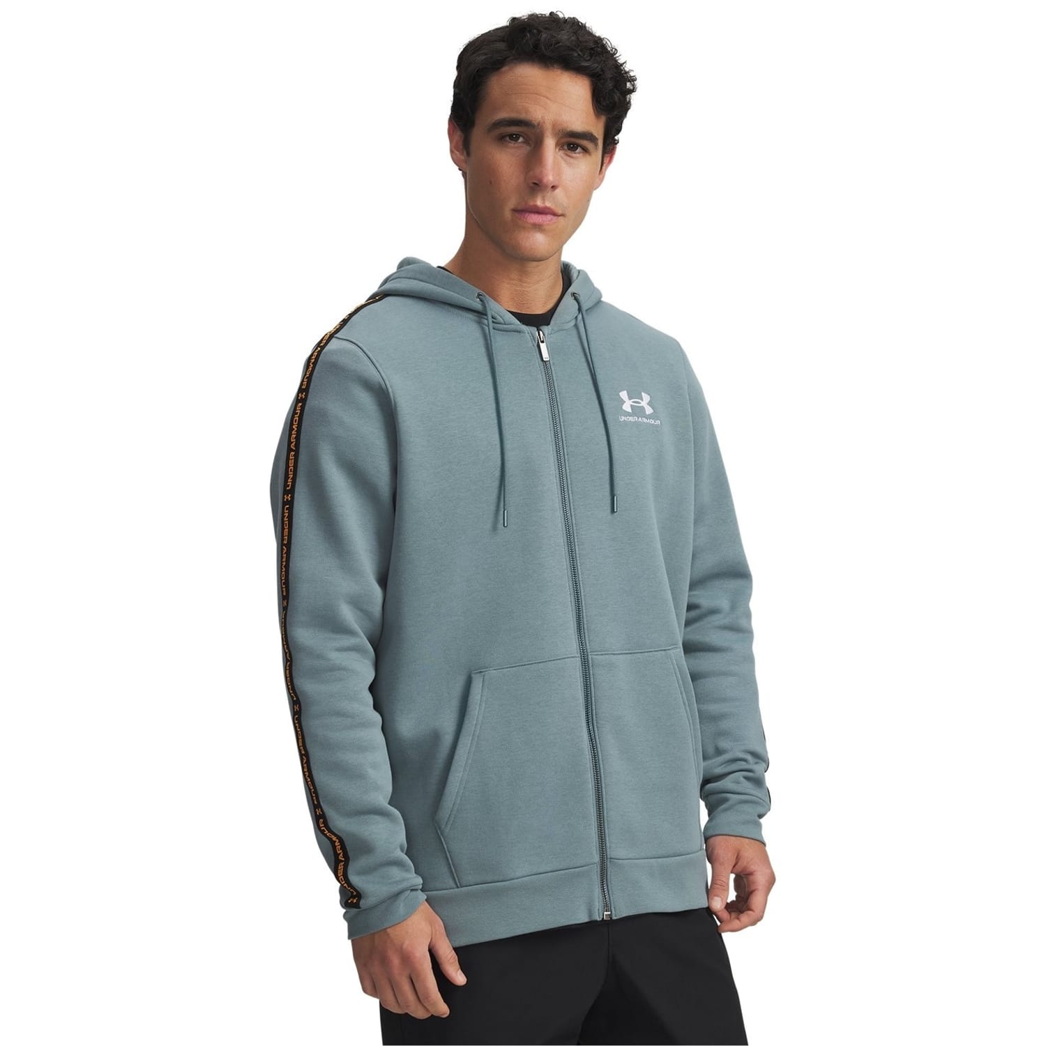 This Under Armour sweatshirt jacket features a hooded neckline and a full zipper closure for easy wear. Designed with a regular fit, it includes ribbed cuffs and a straight hem for a comfortable feel. The solid pattern is complemented by logo embellishments and practical pockets, making it a versatile addition to your wardrobe. -