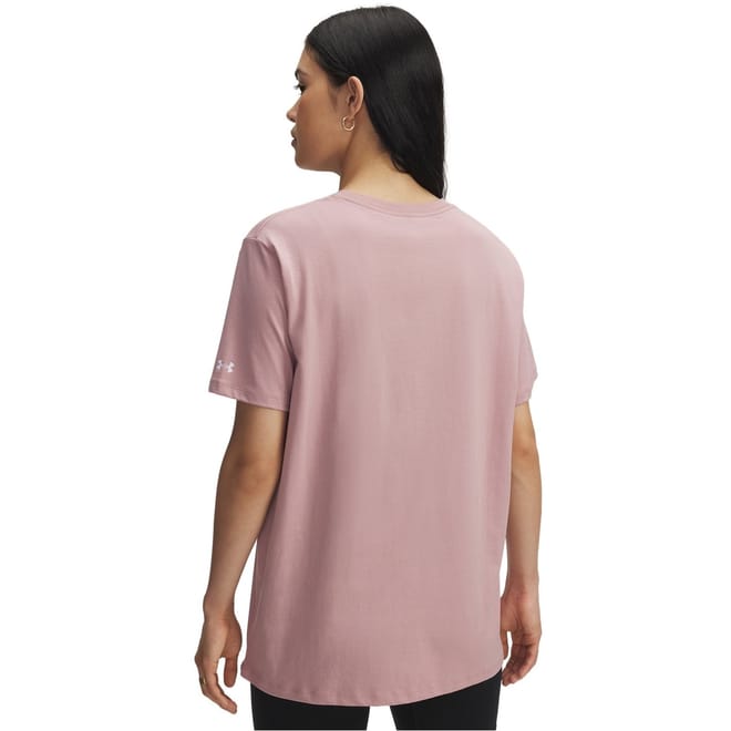 This Under Armour top features an oversized fit with a crew neck and short sleeves. The casual collection piece is adorned with a graphic print and lettering, complemented by a logo embellishment. -