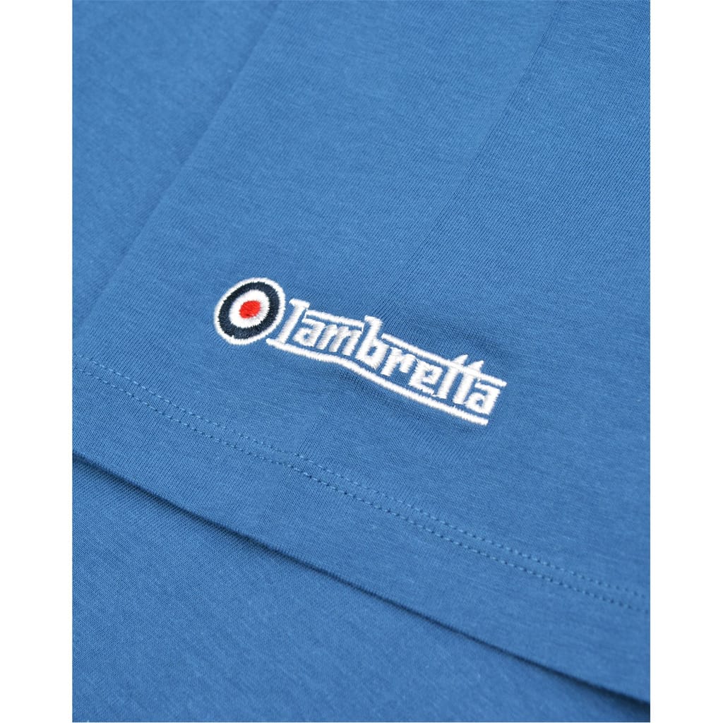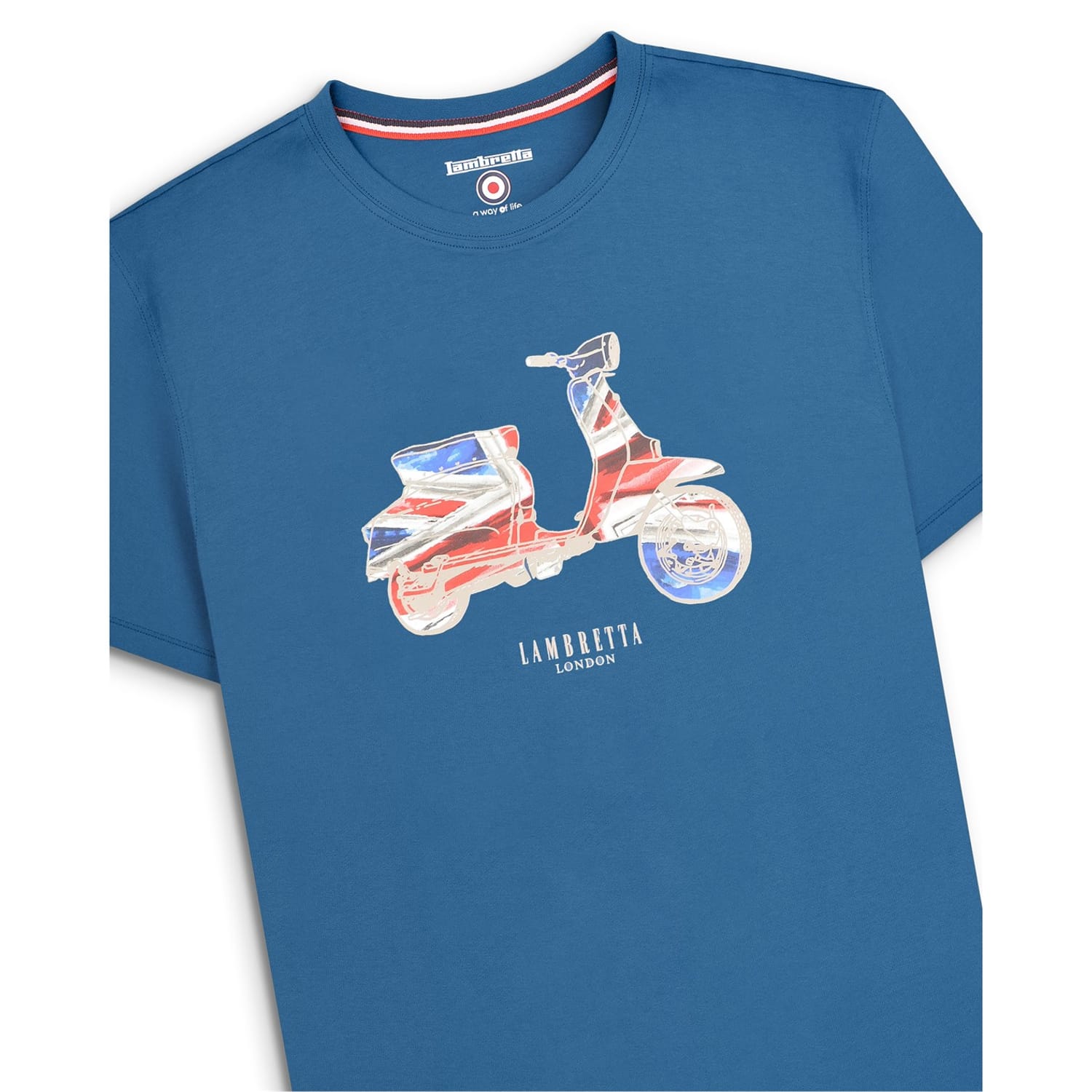 Celebrate casual style with the Lambretta t-shirt, showcasing a distinctive flag graphic. Crafted for a regular fit, this top features a classic crew neck and short sleeves. The ribbed collar adds a touch of texture, making it a versatile piece for everyday wear. -