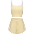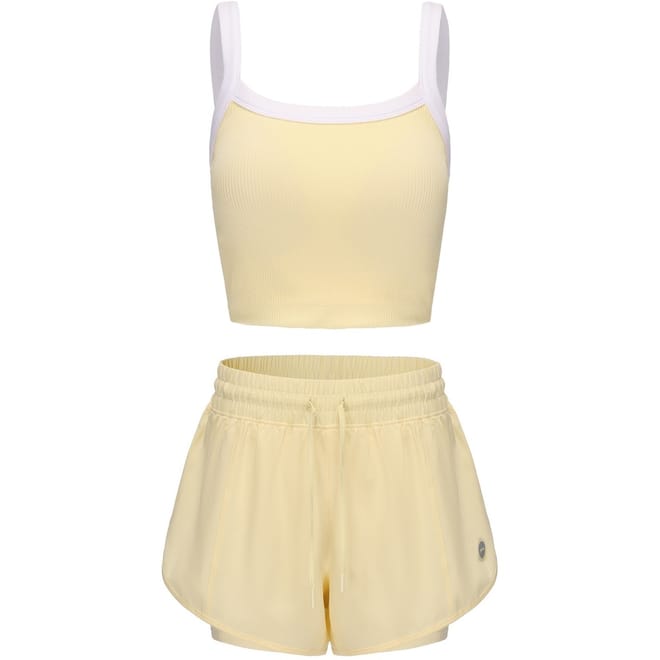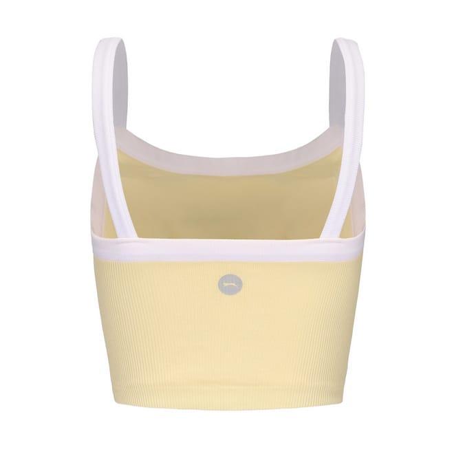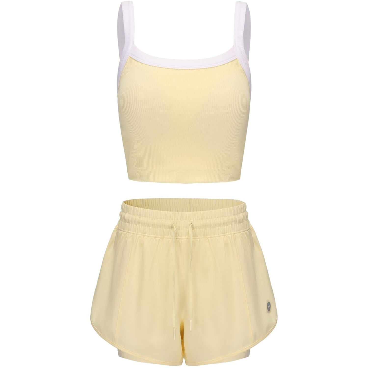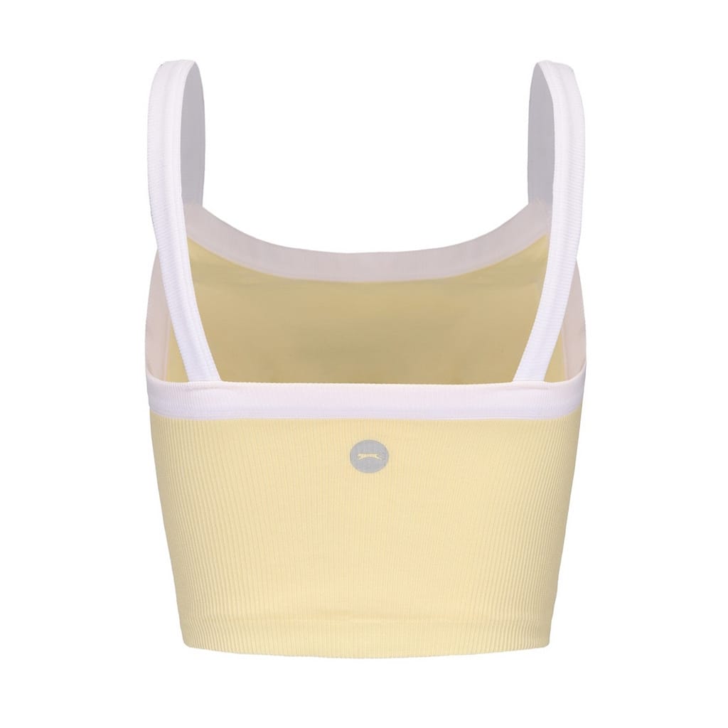 This Slazenger top short set is perfect for sporting activities. The set includes a ribbed bra with a square neck and spaghetti straps, offering medium impact support. The sleeveless design ensures comfort and freedom of movement. The bermuda shorts add a casual style, while the logo embellishment adds a touch of brand identity. -