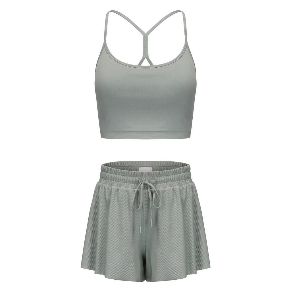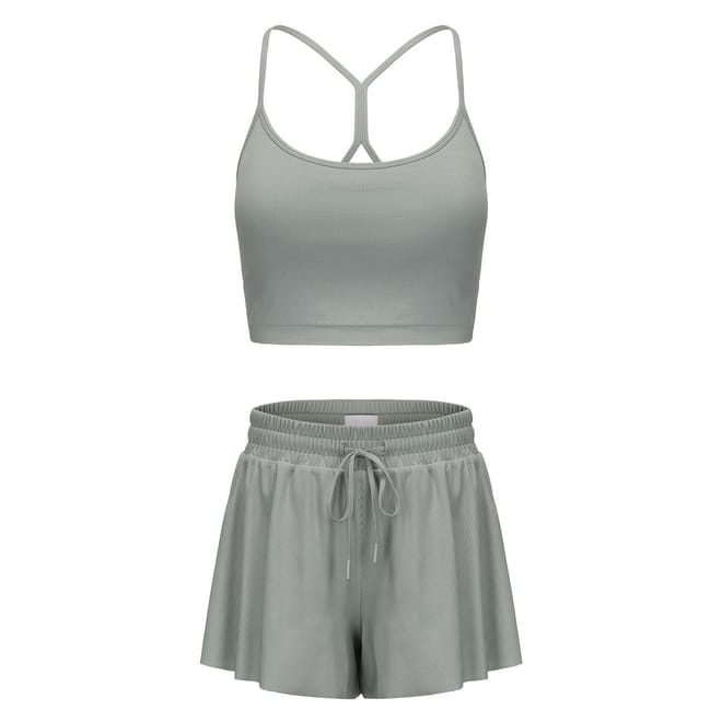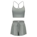 This Slazenger top short set features a sleek athletic design, perfect for casual outings. The set includes a sleeveless bra with a scoop neck and spaghetti straps, offering a comfortable fit. Paired with bermuda shorts, this ensemble is both stylish and functional. The set is completed with a subtle logo embellishment, adding a touch of brand identity. -