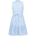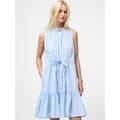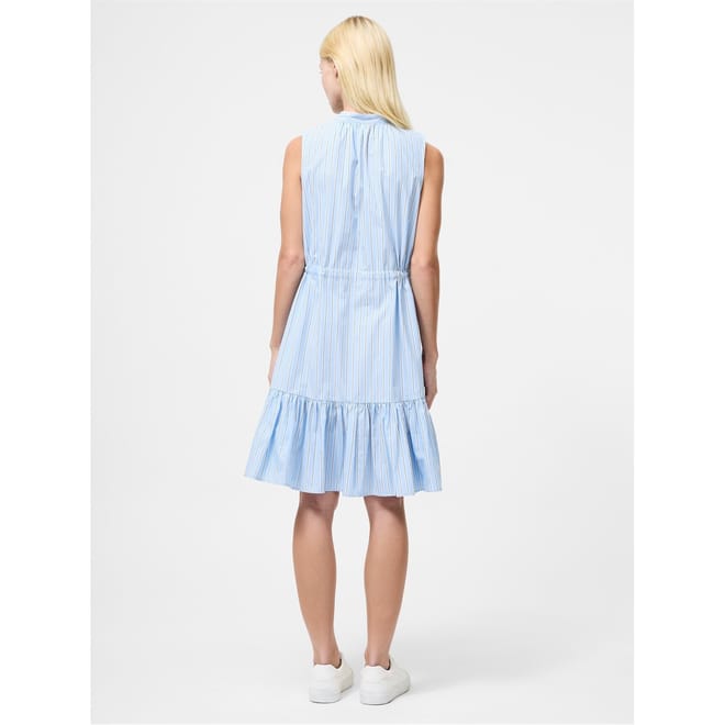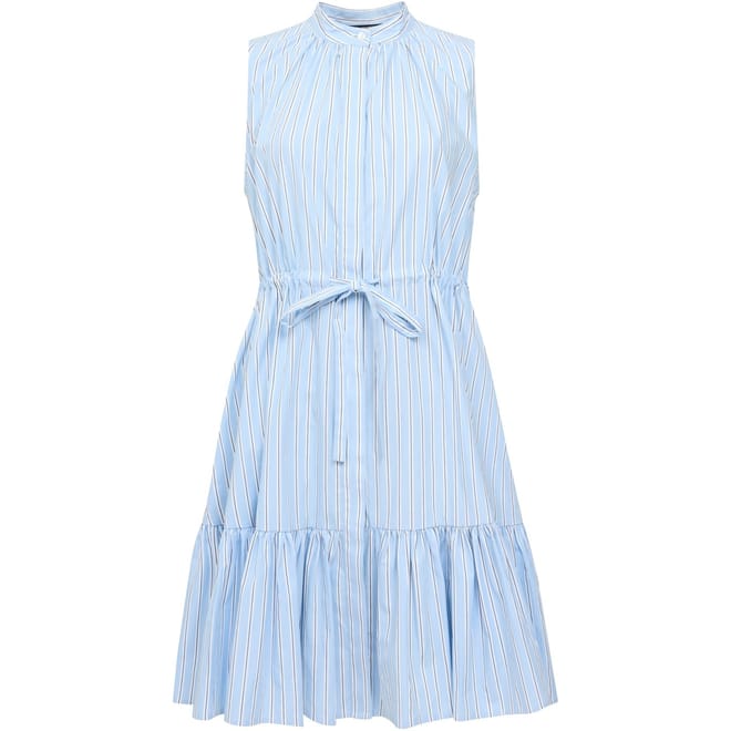 Discover the French Connection tiered dress, a stylish knee-length piece featuring a high neck and a ruffle hem. This dress showcases a classic stripe pattern and includes practical pockets. The button closure adds a touch of elegance, making it a versatile addition to any wardrobe. -