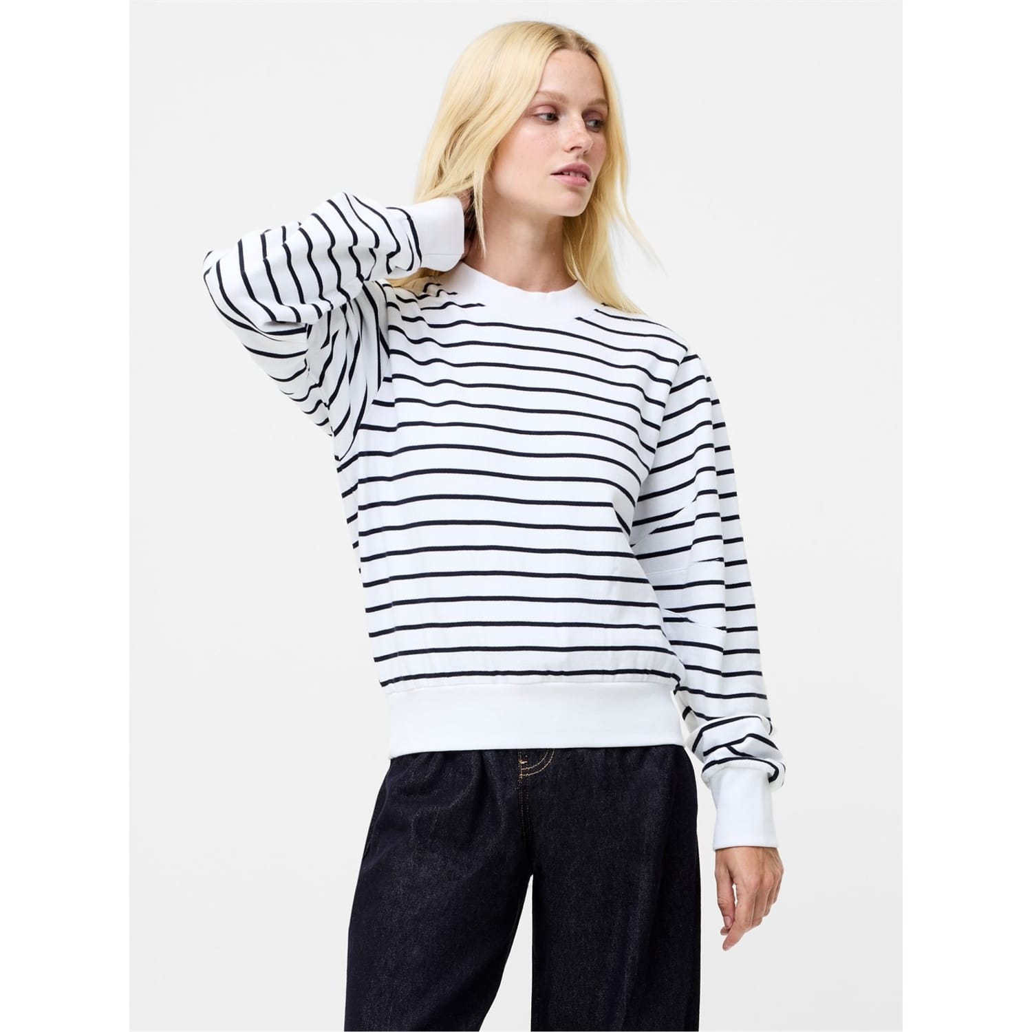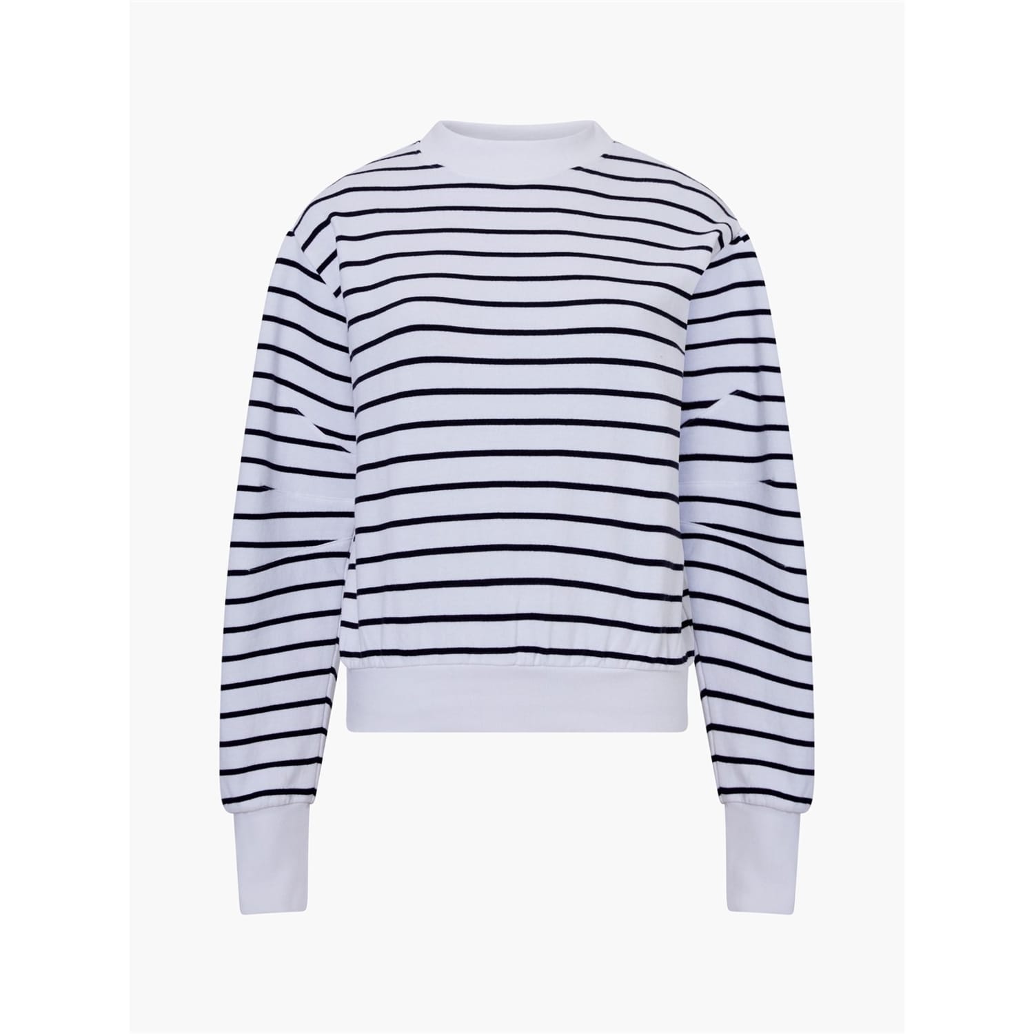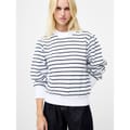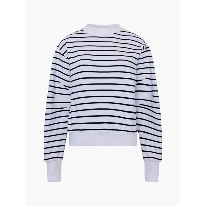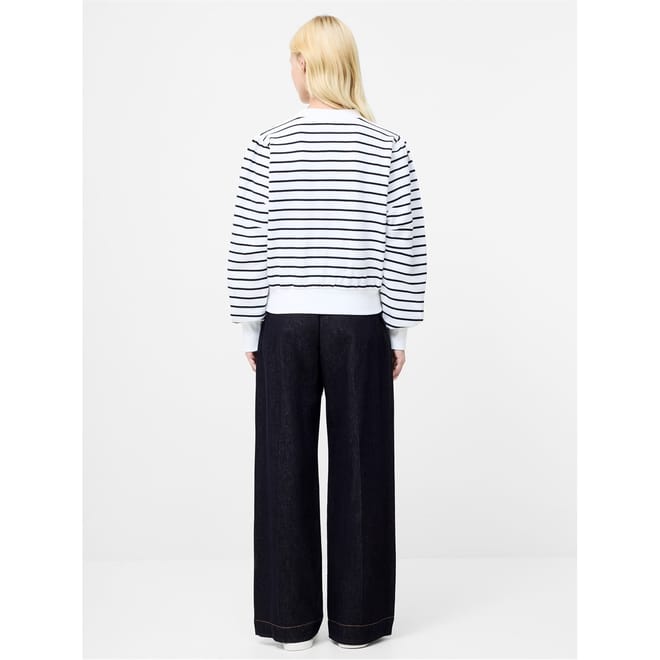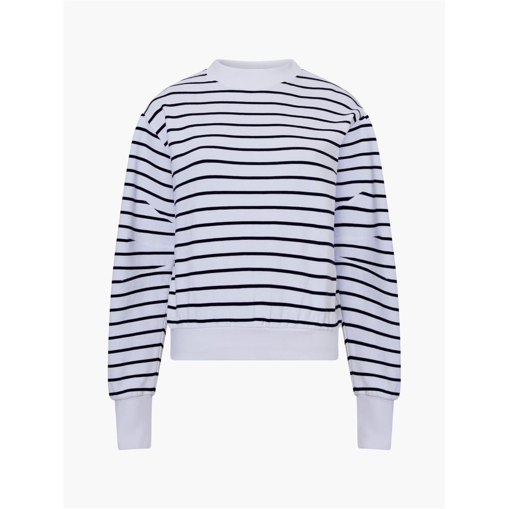 The French Connection Sunday top is a casual piece featuring a relaxed fit and long puff sleeves. It showcases a classic crew neck and ribbed cuffs for added comfort. The striped pattern adds a touch of style, while the logo embellishment subtly highlights the brand. Perfect for a laid-back look. -