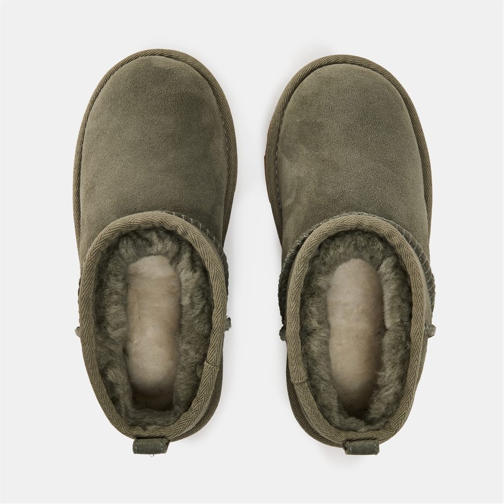 Designed for ultimate comfort, these mini UGG boots deliver cosy luxury in a compact package. The Classic Ultra features premium suede and plush sheepskin lining, making every step feel like walking on clouds. Their low-profile design and durable outsole provide practical everyday wear for little feet, while the signature UGG craftsmanship ensures lasting quality.