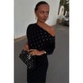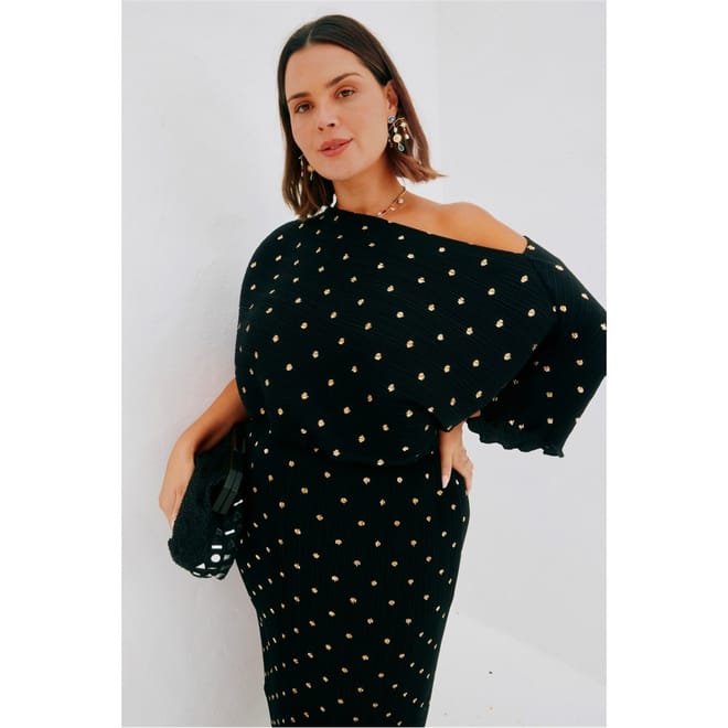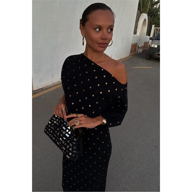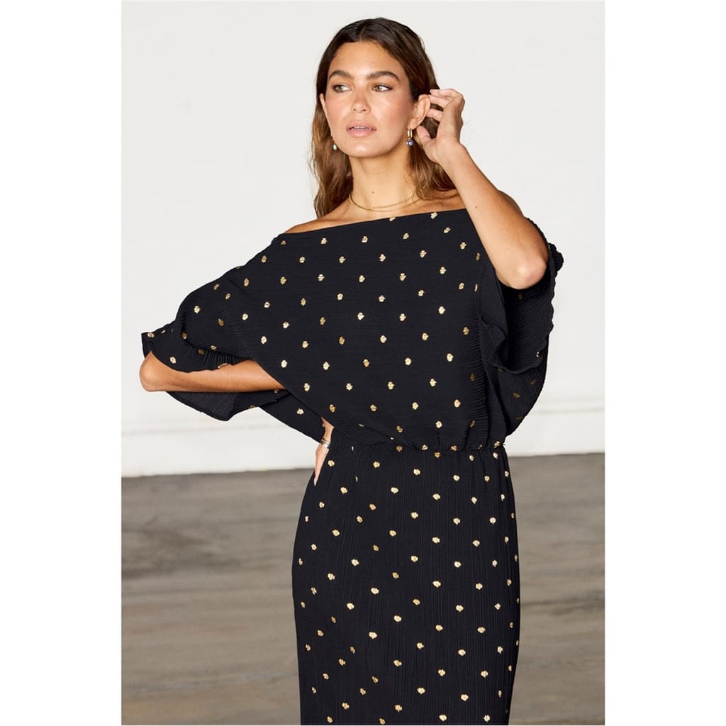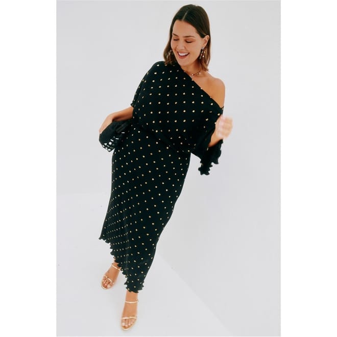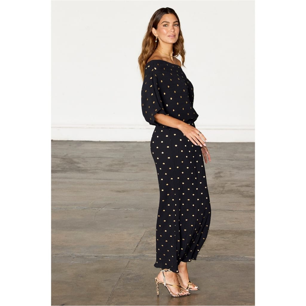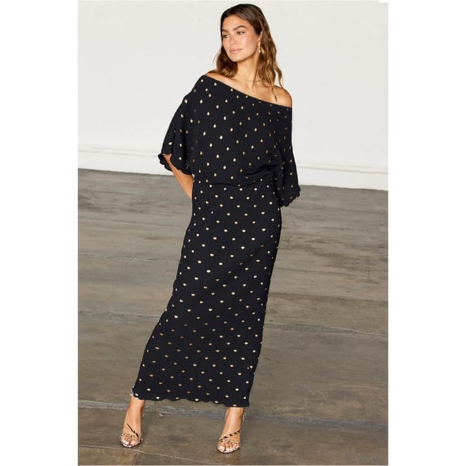 This Never Fully Dressed maxi dress features an elegant off-the-shoulder neckline and a stylish A-line silhouette. The three-quarter puff sleeves add a touch of sophistication, while the playful polka dot pattern enhances its charm. Perfect for making a statement, this dress combines classic design with modern flair. -