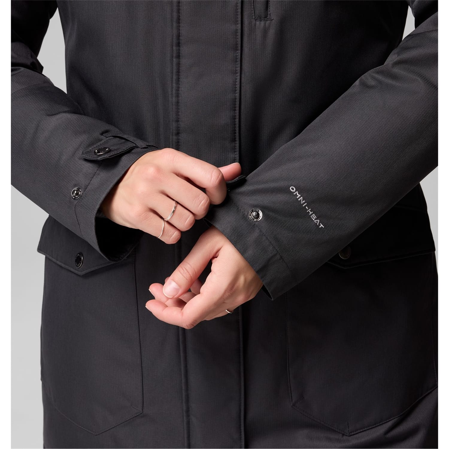 Stay warm this winter with the Columbia parka coat, designed for mountain, sport, and casual collections. This down jacket features a hooded neckline and a relaxed fit, ensuring comfort in cold conditions. The solid pattern and straight hem add to its sleek design, while the zipper closure and elasticated cuffs provide practicality. Embellished with a logo and flap pockets, it's a functional choice for the season. -