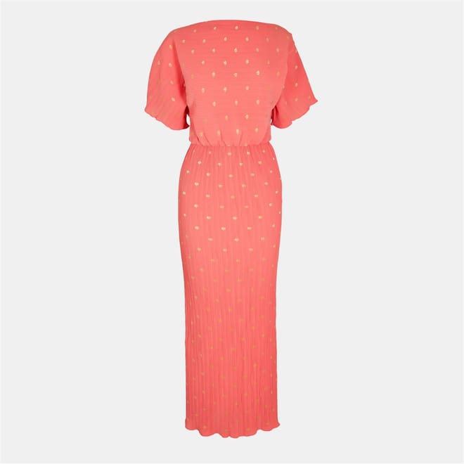 This Never Fully Dressed maxi t-shirt dress features a playful polka dot pattern. The boat neck and puff sleeves add a touch of elegance, while the straight hemline ensures a clean finish. Perfect for those seeking a stylish yet comfortable option. -