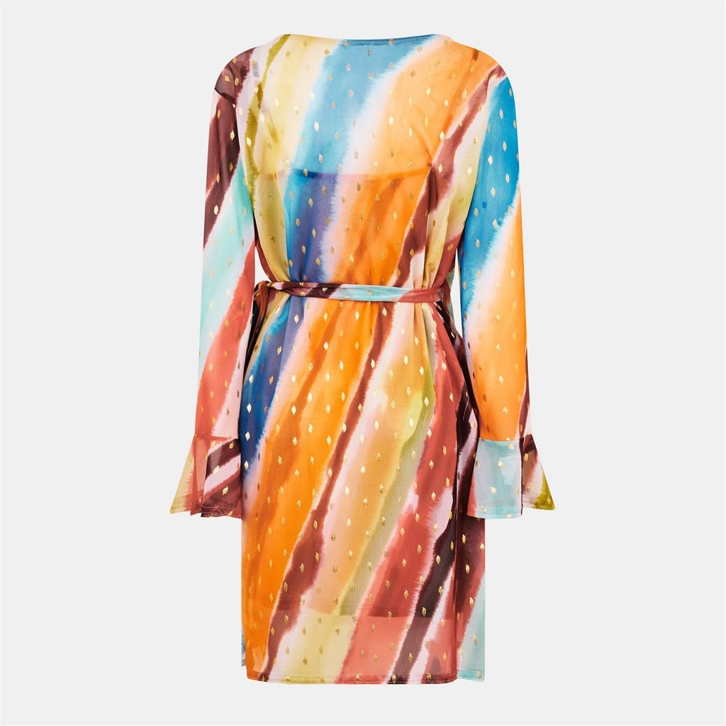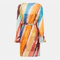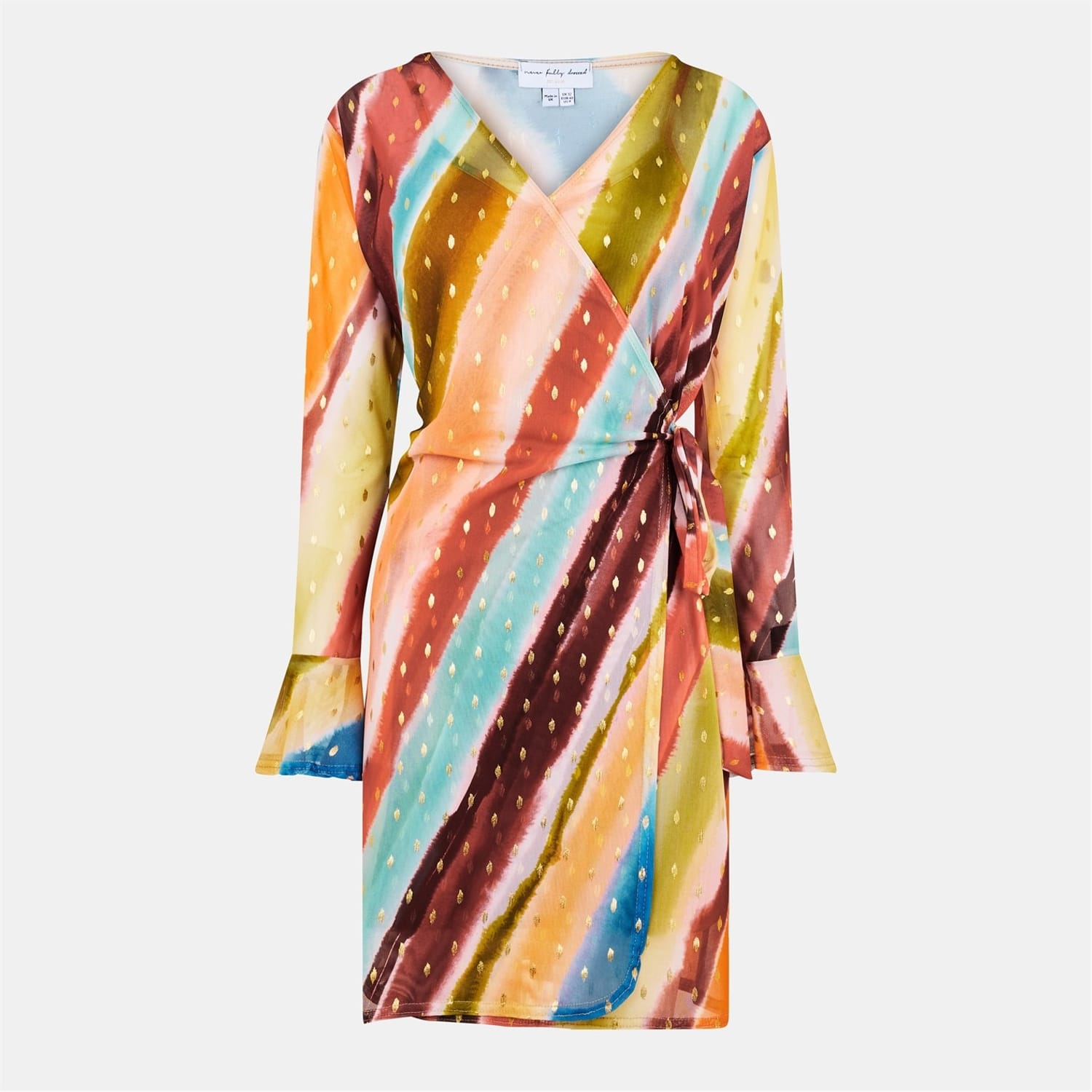 This Never Fully Dressed wrap dress features a knee-length design with a stylish v-neck and bell sleeves. The dress showcases a striking stripe pattern and a straight hem, offering a sophisticated look. The tie closure adds a touch of elegance, making it a versatile choice for various occasions. -