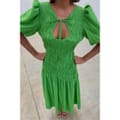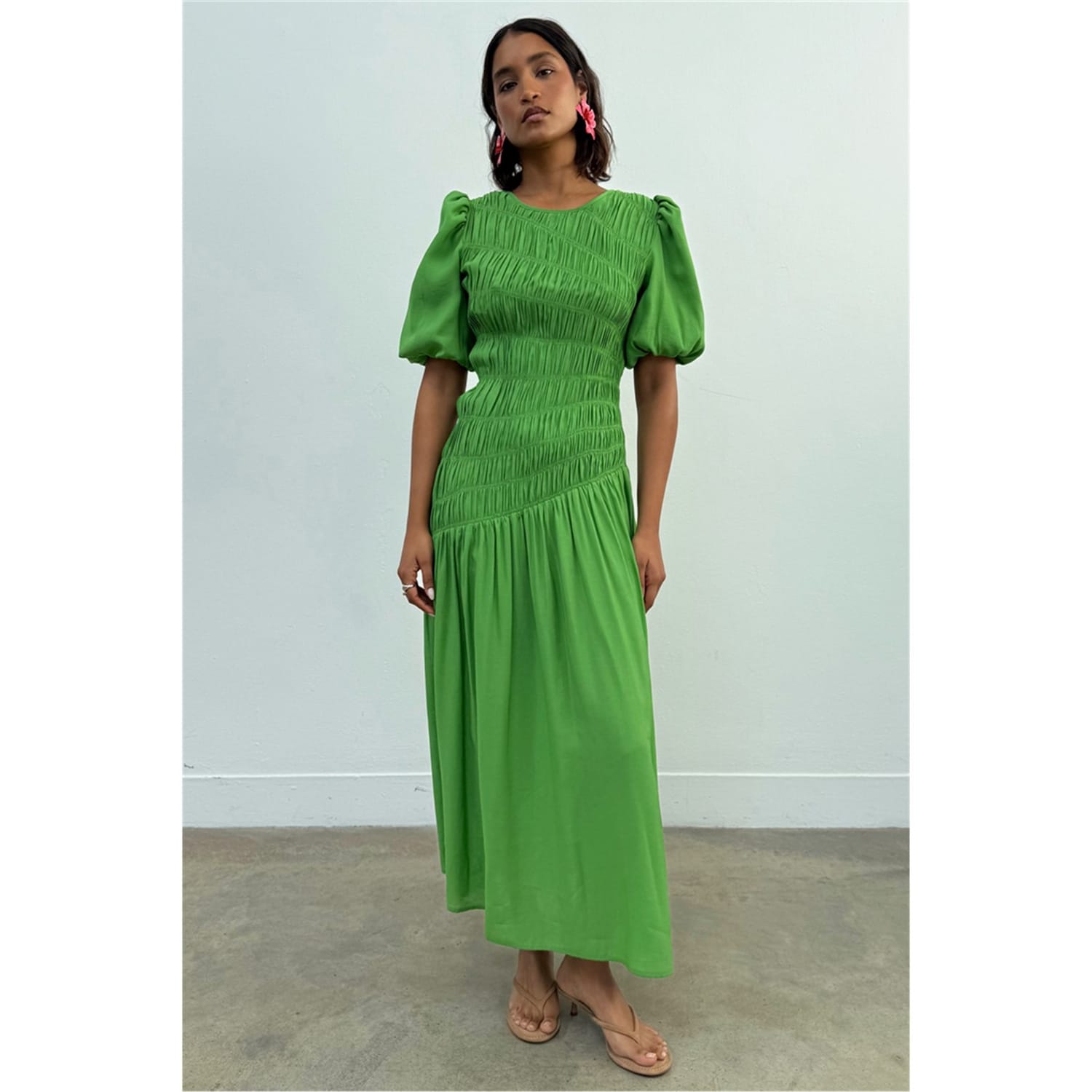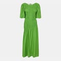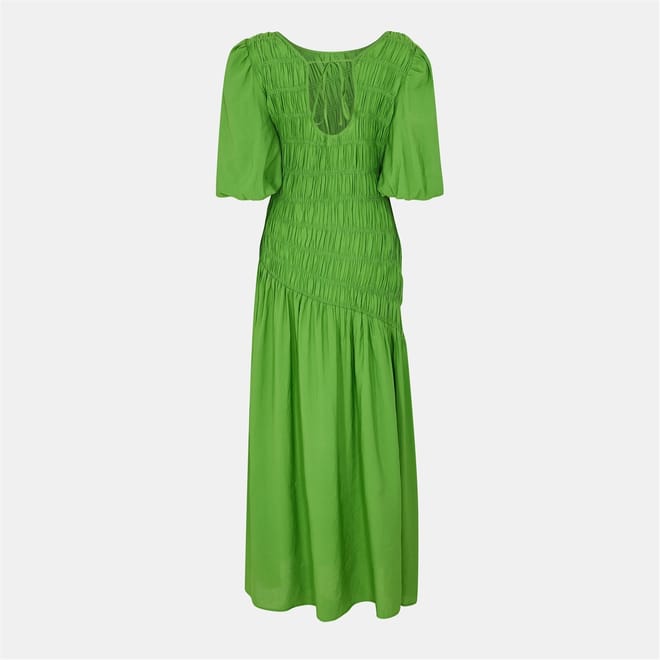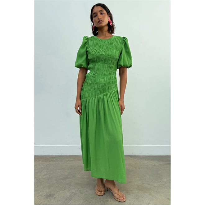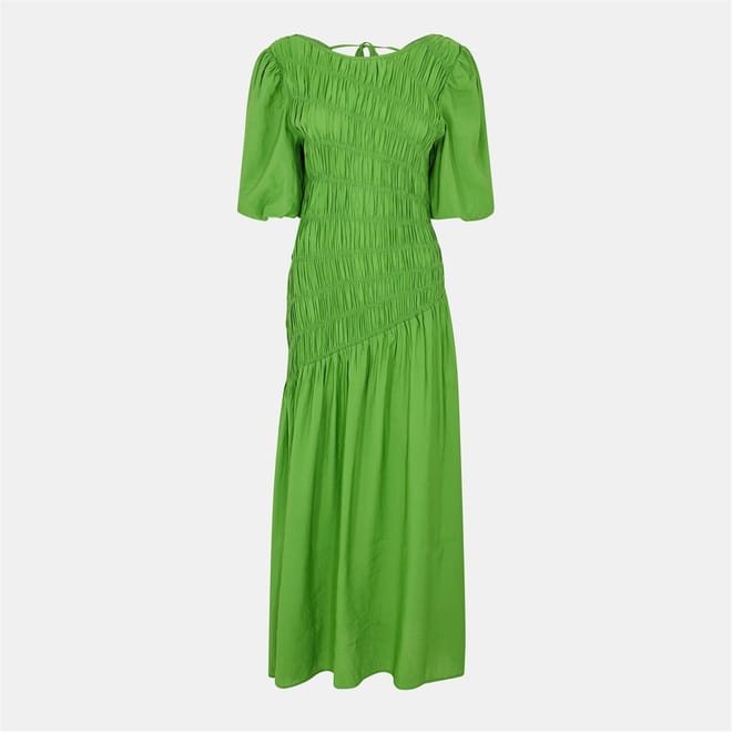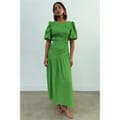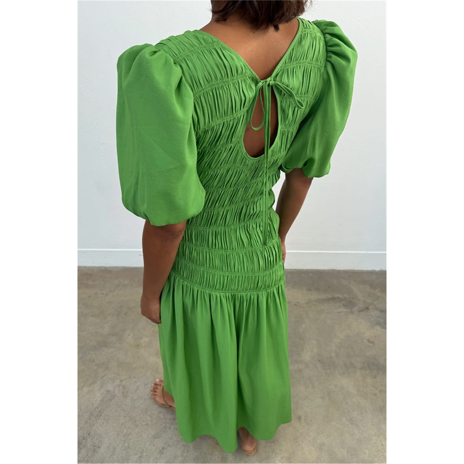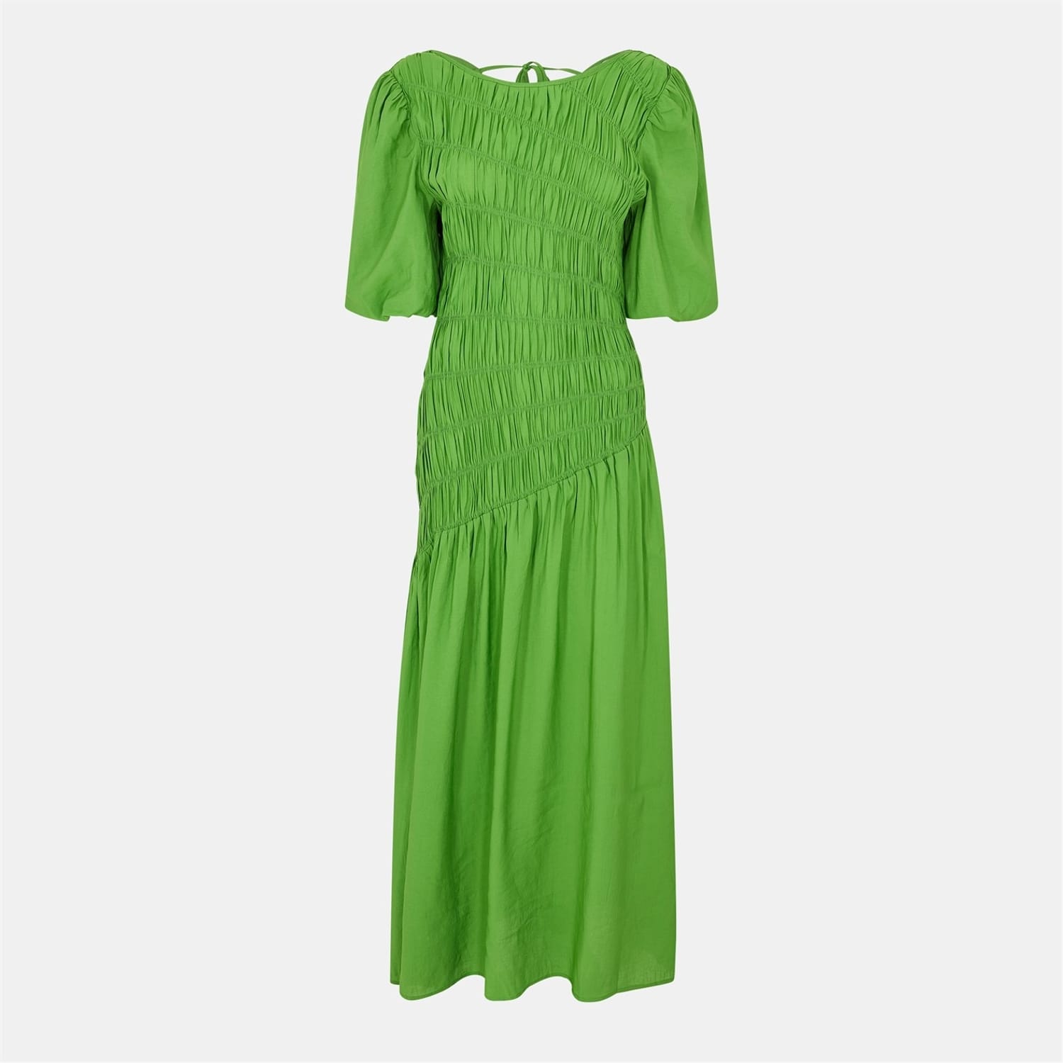 This Never Fully Dressed babydoll dress is a stunning maxi piece featuring a v-neck and puff sleeves. The asymmetrical hem adds a unique touch, while the tie-back closure ensures a perfect fit. The solid pattern and ruched embellishments enhance its elegant appeal, making it a versatile addition to any wardrobe. -