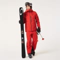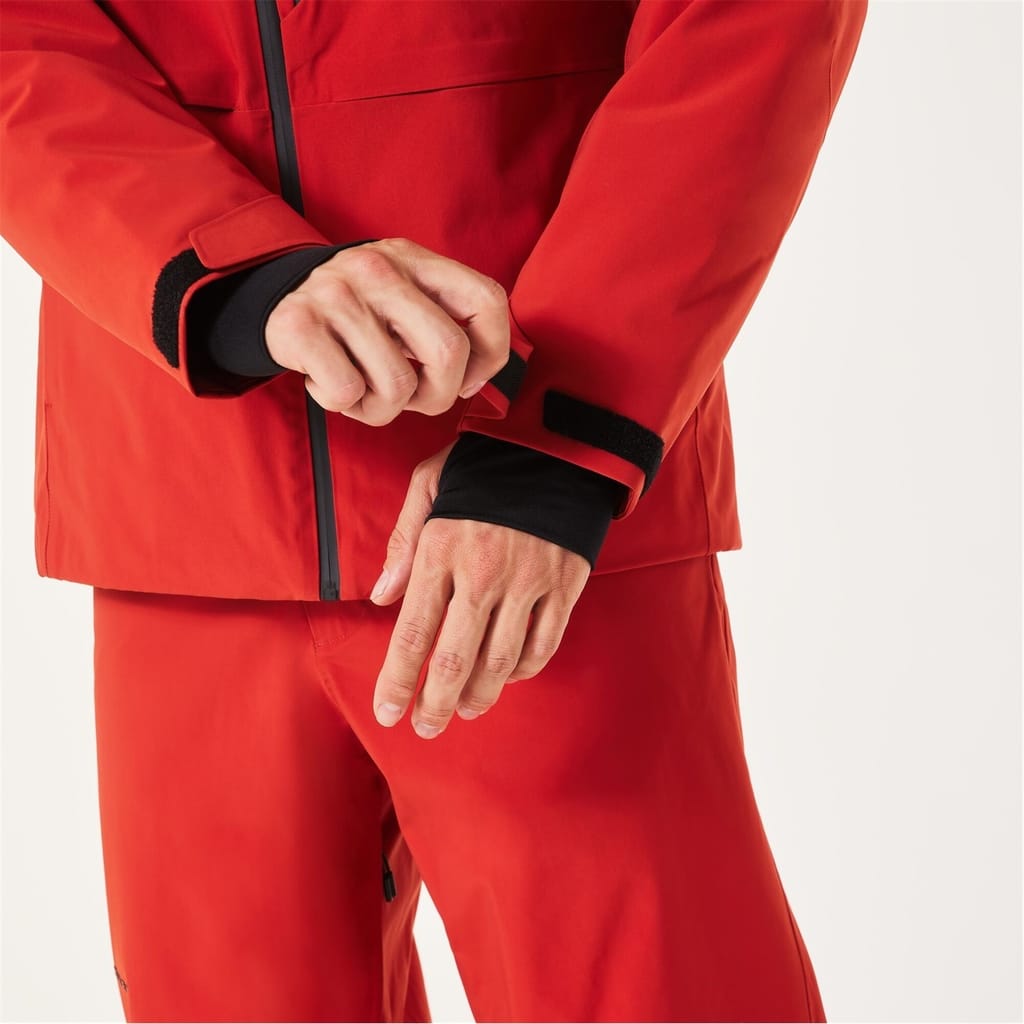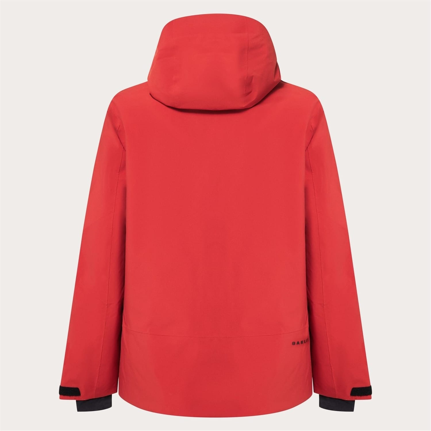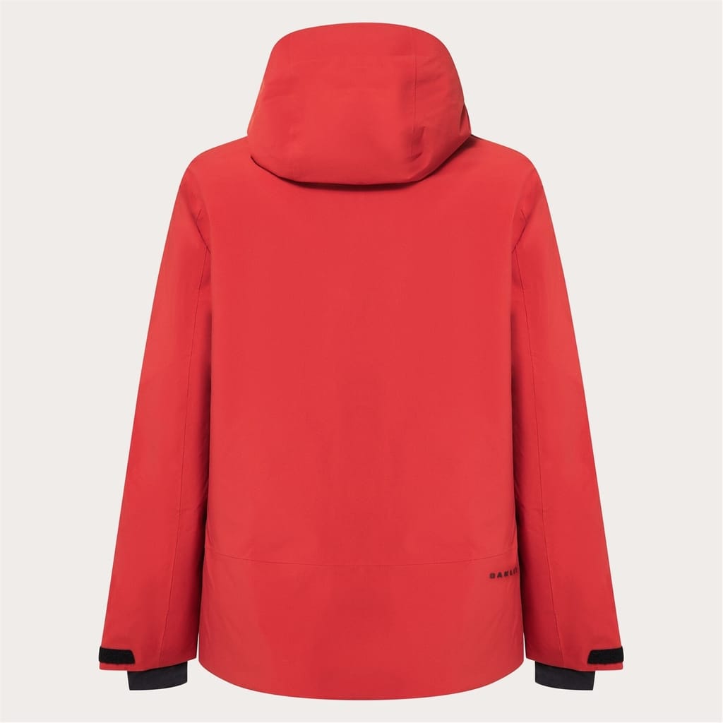 The Oakley ski jacket is designed for sporting activities, featuring a hooded neck and a regular fit. It includes a zipper closure with additional drawstring and hook-and-loop fastenings. The jacket is equipped with zipped pockets and a logo embellishment. Its solid pattern and straight hem offer a sleek look, while the fitted cuffs ensure comfort and warmth. -