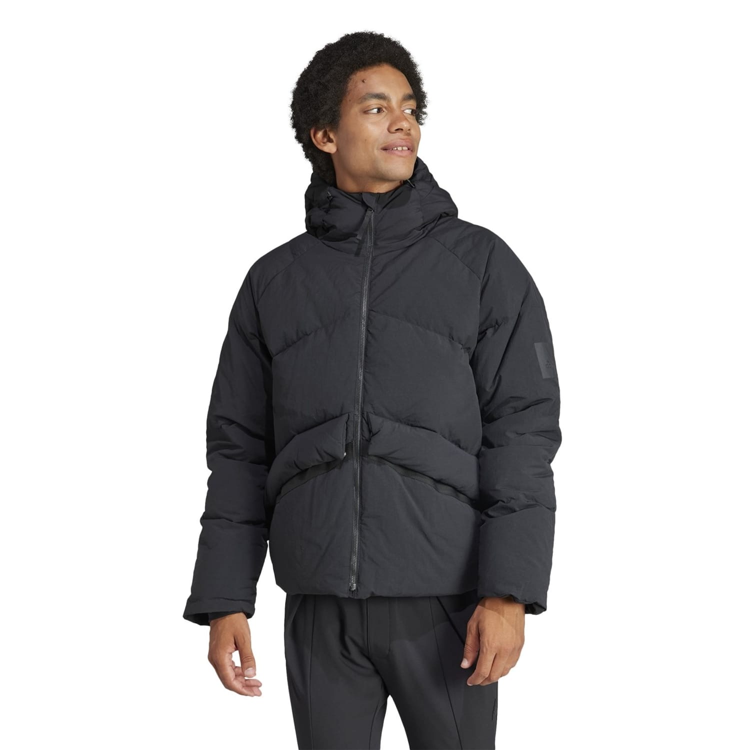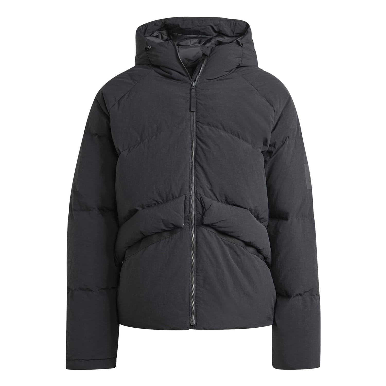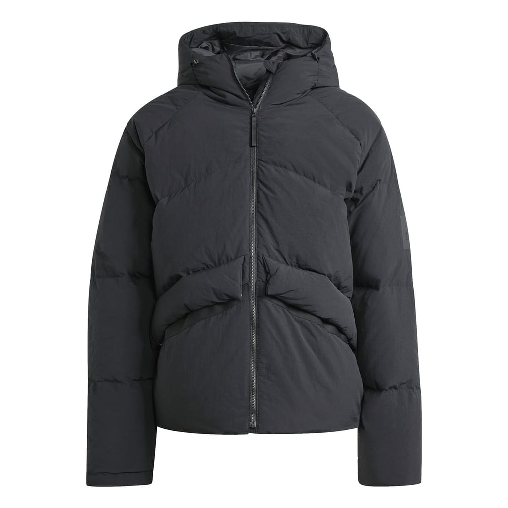 Embrace chilly weather head in this adidas jacket. Designed with extra-wide baffles, it shows off a puffy look for added style. Duck down insulation and an adjustable hood shield you from the cold. Double-entry pockets ensure your hands always stay toasty.
