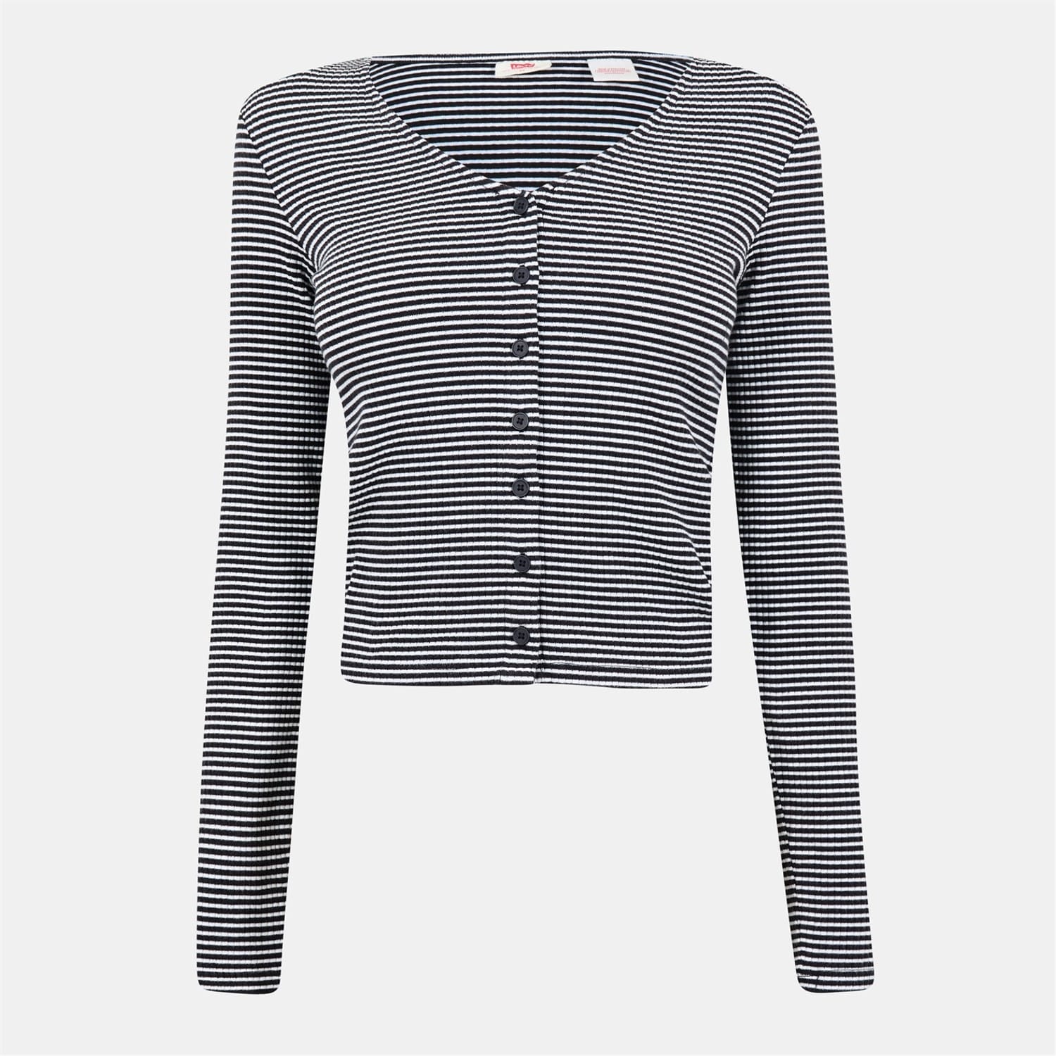 This Levi's cropped top is a stylish addition to your casual collection. Featuring a v-neck and long sleeves, it offers a slim fit that complements its striped pattern. The button closure adds a classic touch, making it a versatile piece for various occasions. -