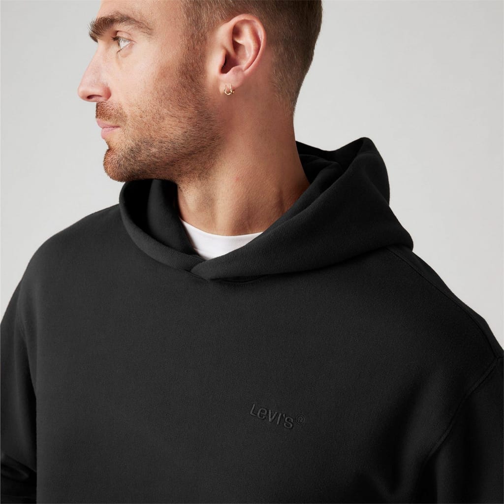 This Levi's top is a casual essential featuring a hooded neck and long sleeves. Designed in a regular fit, it includes ribbed cuffs and a solid pattern. The top is embellished with a pocket and a logo, adding a touch of style to its simplicity. -