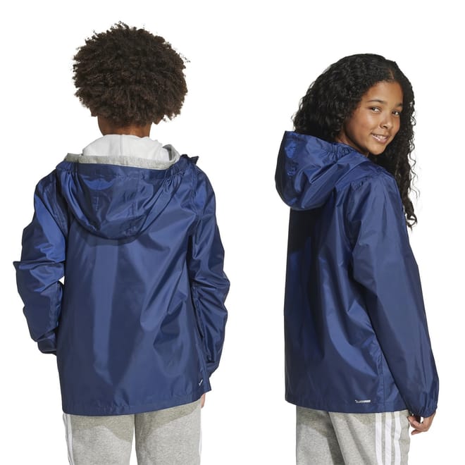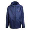 This adidas rain jacket is designed with a hooded neckline and a zipper closure, offering a regular fit. It features a water-repellent finish, ensuring protection against the elements. The jacket includes an elasticated cuff and a straight hem for added comfort. A solid pattern with a logo embellishment completes the look. -