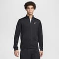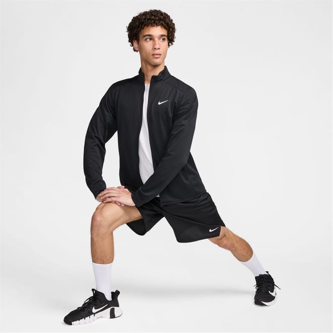 Nike's activewear piece features a mock neck and a regular fit, designed for performance. The knit construction is complemented by a ribbed cuff and a straight hem. A solid pattern with a logo embellishment adds a touch of brand identity. The jacket is equipped with a zipper closure, making it a practical choice for active pursuits. -