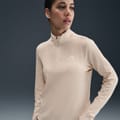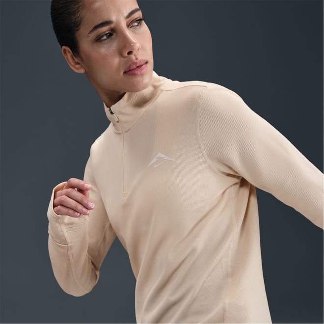 This Nike trail top is designed for performance and is part of the activewear collection. It features a zip neck and a convenient zipper closure. The ribbed pattern and ribbed cuffs add a touch of style, while the long sleeves ensure comfort in all seasons. The regular fit and logo embellishment complete this versatile piece. -