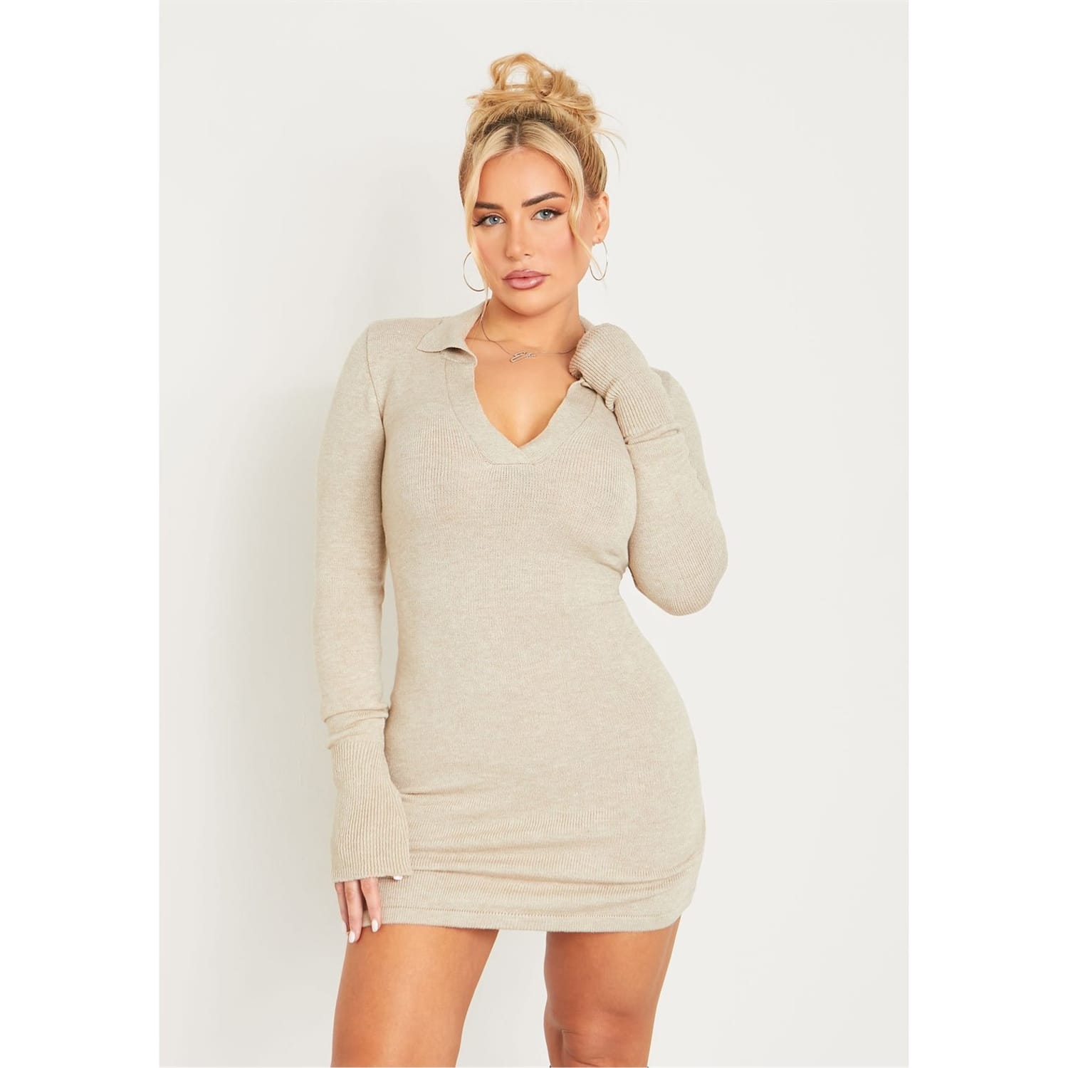 Stock up on knitted mini dresses this season, starting with our Knitted Flare Cuff Collared Mini Dress, featuring a flared sleeve and collared detail. So cute styled with some calf boots. -