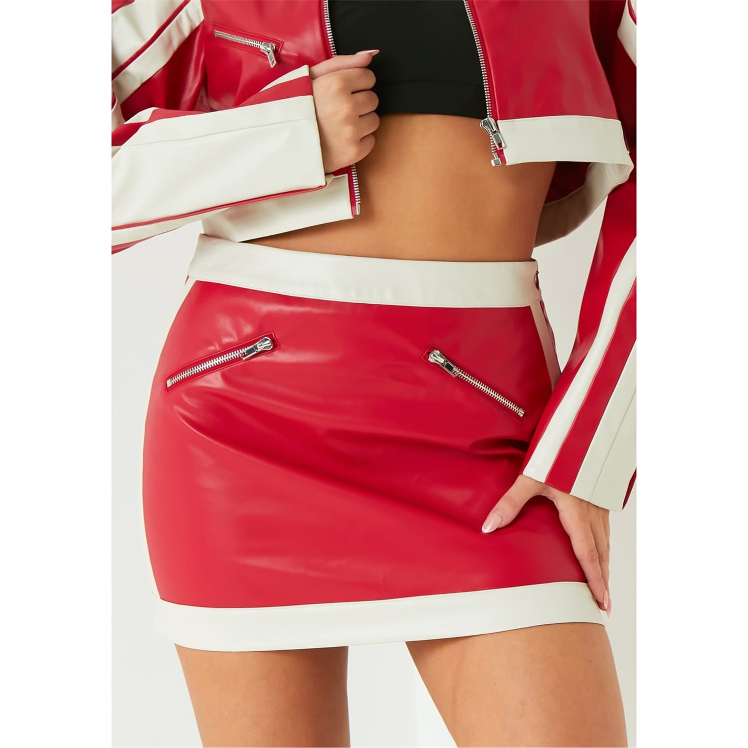 Turn heads and elevate your style with our stunning Contrast Faux Leather Mini Skirt! This edgy yet chic piece is designed for the modern woman who isn’t afraid to make a statement. -