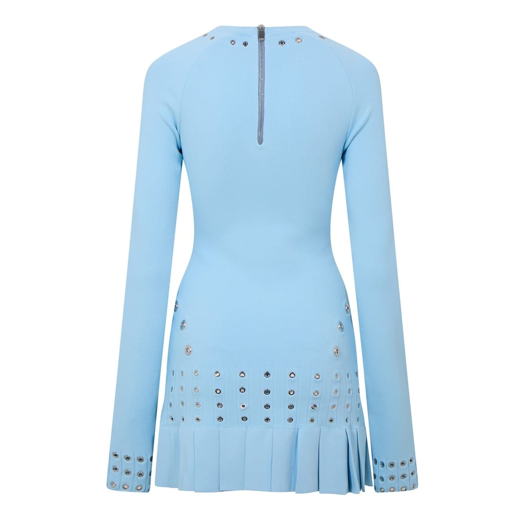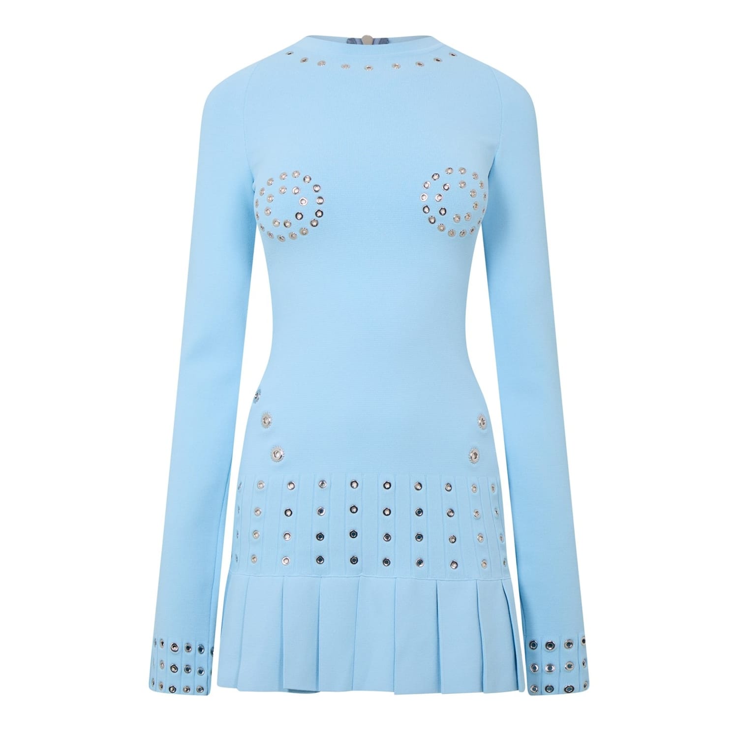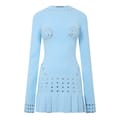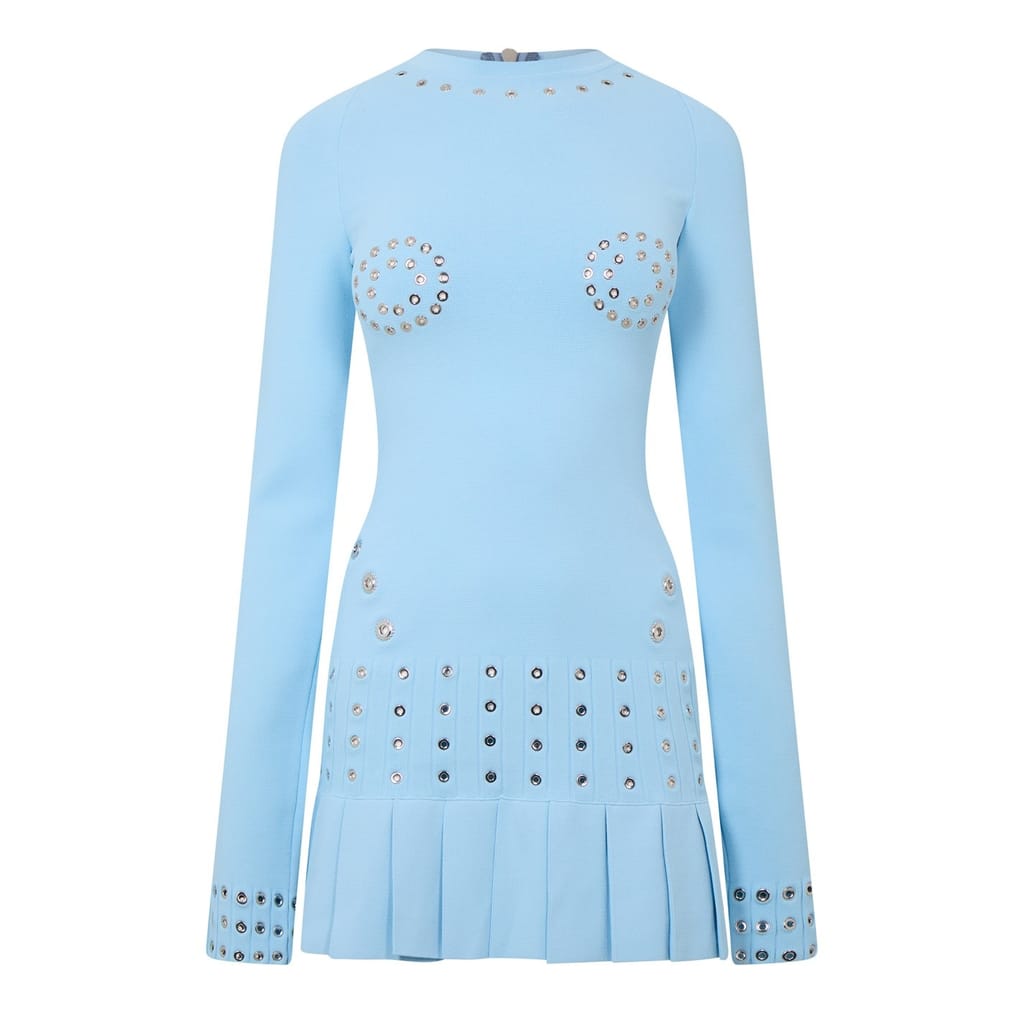 The Eyelet Pleated Mini Dress by Off-White, from their fashion collection, features delicate eyelet patterns. This clothing piece showcases precision pleating, making this mini dress a standout addition to any wardrobe.
