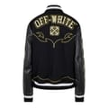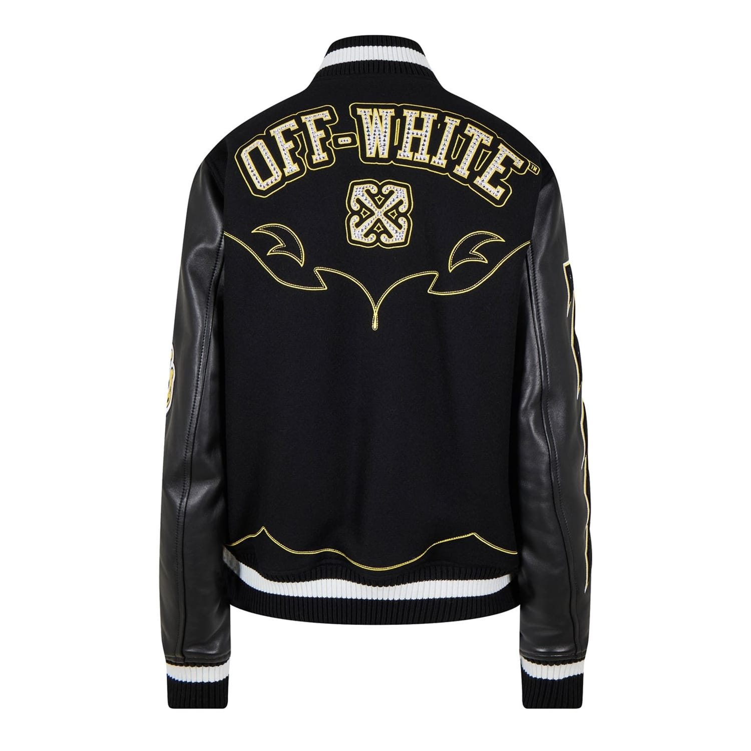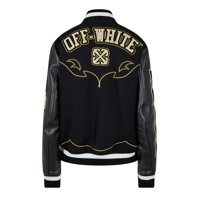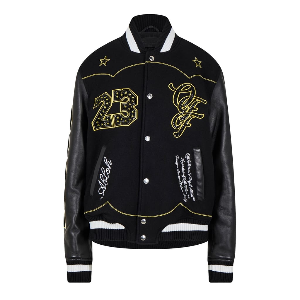 This Off-White varsity jacket features a ribbed crew neck and raglan sleeves, offering a comfortable regular fit. The jacket is adorned with embroidered logos and lettering, complemented by a number on the back. It has a solid pattern with ribbed cuffs, collar, and hemline. The snap button closure adds a classic touch to this stylish piece. -