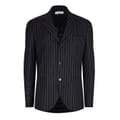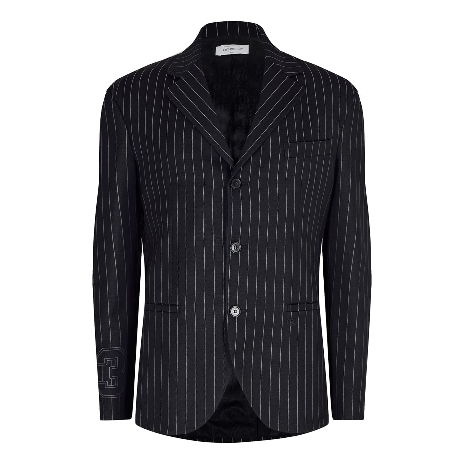 This Off White blazer jacket is part of the workwear collection, featuring a lapel collar and a button closure. It boasts a regular fit and a distinctive stripe pattern, complemented by a curved hem. Embellished with a logo, this jacket seamlessly combines style and functionality, making it a versatile addition to any wardrobe. -