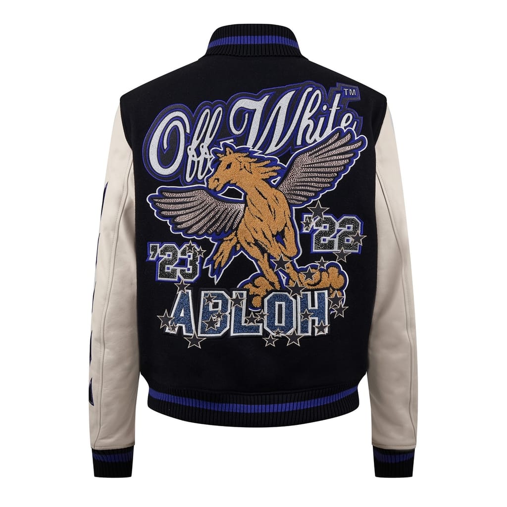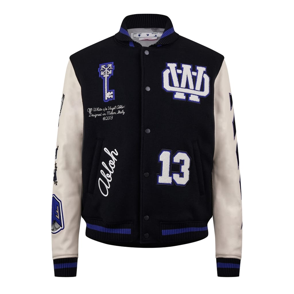 This Off White varsity jacket features a snap button closure and a regular fit. The jacket showcases a graphic print, complemented by embroidered logo embellishments and patches. For added style, it includes a ribbed collar, hem, and cuffs. -